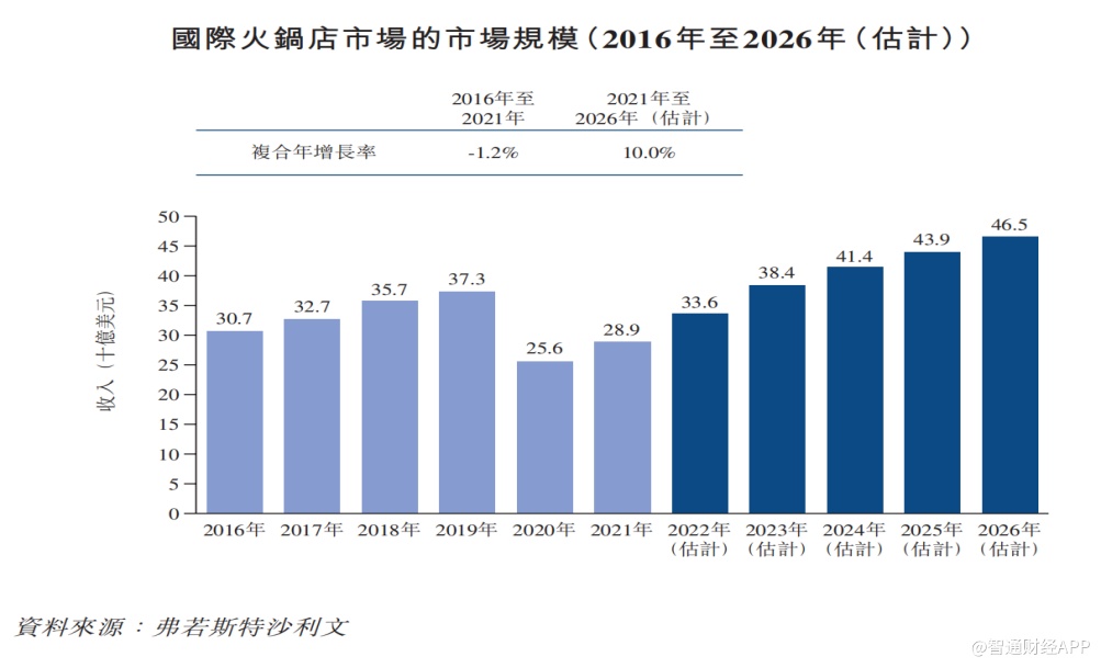 由于火锅店数量越来越多,火锅越来越受欢迎及更易于通过本地化吸引当地顾客,以及其高度可扩张性及标准化,火锅店在国际市场的增长速度预期将超过其他中式餐饮的增长速度,2026年将达到465亿美元,复合年增长率为10.0%。
