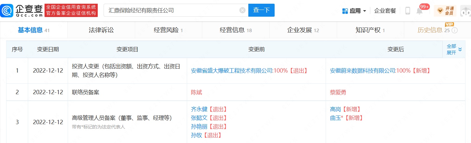 智通财经APP获悉,企查查APP显示,近日,汇鼎保险经纪有限责任公司发生工商变更,原股东安徽省盛大爆破工程技术有限公司退出,新增安徽蔚来数据科技有限公司为股东并全资持股;同时该公司法定代表人由孙牧变更为曲玉,高管人员也已更换。据公开资料显示,该公司成立于2014年5月,注册资本5000万人民币,经营范围为保险经纪业务。