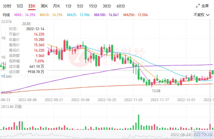 12月14日,长飞光纤光缆平开高走,盘中涨幅一度超过7%,收盘报15.28港元,涨幅7.45%。而在11月,该标的日K线一度出现了九连阴,单月累计跌幅达到了14.22%。