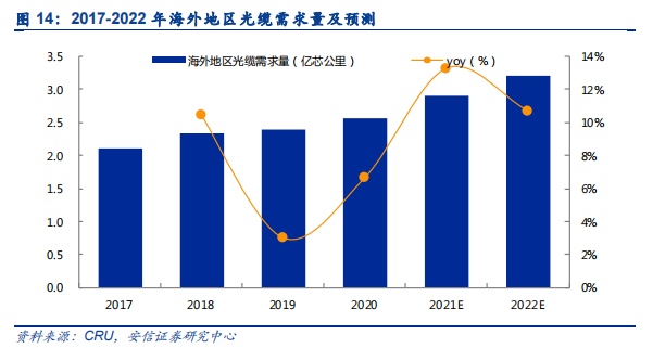 海外方面,在国家宽带战略推动下,北美、欧洲、印度等地区的主流运营商纷纷加快固网宽带规模建设。根据QYResearch,德国计划2021年底实现99%的家庭能够接入高速互联网,包括农村地区。英国、法国、意大利等欧洲主要国家同样出台国家政策,加快FTTH建设步伐,成为海外光纤光缆需求增长的主要驱动力。据CRU预测,2022年全球光缆需求预计将达5.82亿芯公里;其中海外地区预计将达3.21亿芯公司。