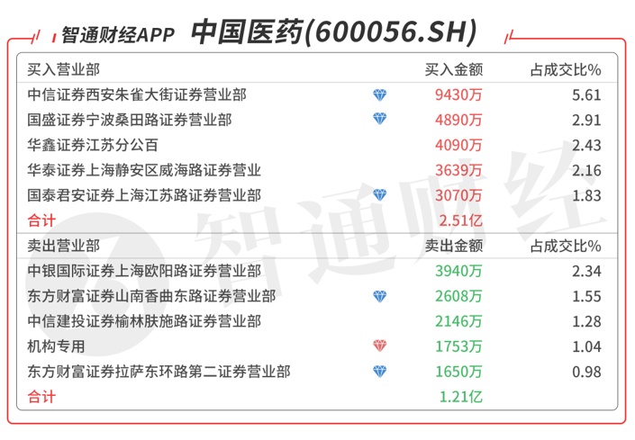 中国医药(600056.SH):龙虎榜阵容豪华,机构与游资出现分歧,机构席位卖出1753万元,买一是顶级游资方新侠的席位买入9430万元,买二是知名游资的席位买入4890万元,买五是顶级游资章盟主的席位买入3070万元,当日净买入1.3亿元,该股今日T字板,强势特征明显。