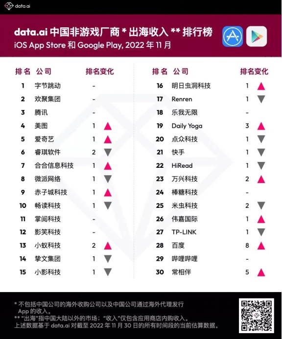 不仅国内市场领先,爱奇艺国际站业务也频传捷报。data.ai今日发布的发布11月中国非游戏厂商及应用出海收入排行榜中,非游戏厂商收入榜单前三名(按排名先后顺序)仍为字节跳动、欢聚集团和腾讯,爱奇艺上升一位来到第五。