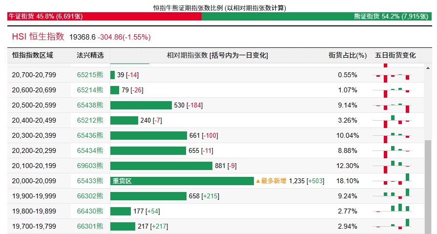 法兴恒指牛熊证街货分布图中的数据显示,熊证街货重货区在20000-20099区间,该区间最新熊证数量为1235张,较上一交易日增加503张;最多新增在同一区间。