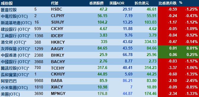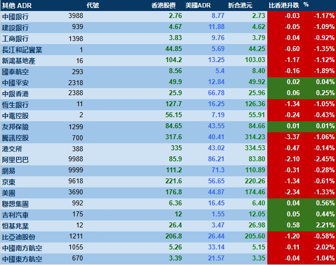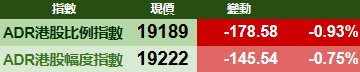 智通财经APP获悉,周四美股三大指数集体收跌,港股ADR指数下跌,按比例计算,收报19189点,较香港收市跌178.58点或0.93%。