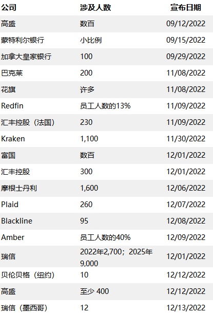 以下是一份正在裁员或停止招聘的银行及其他金融公司名单: