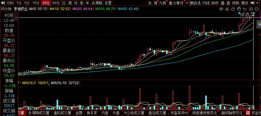 受囤药潮的影响,11月以来,新冠治疗药当中的布洛芬概念股,经历了从上涨到疯涨的过程。进入12月中旬,第一梯队的龙头股更是动不动就表演“20cm”涨停,风头盖过其他绝大多数概念板块。亨迪药业的股价更是直接翻了两倍,从11月初的18.37元到12月16日的55.63元涨幅已超200%!