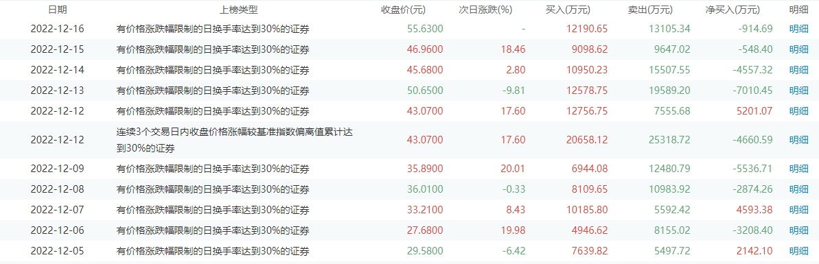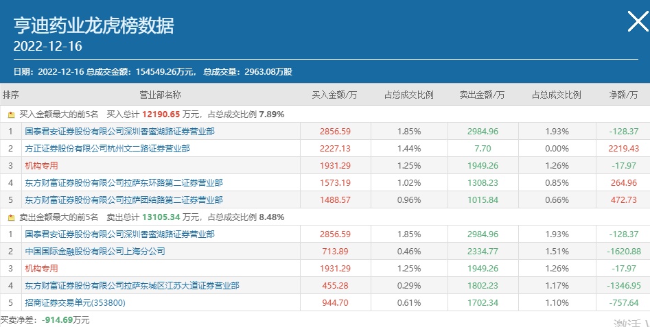 12月16日,深交所披露,亨迪药业在12月7日至12月16日涨幅严重异常期间,获自然人买入76.15亿元,占比78.52%;其中,中小投资者累计买入49.63亿元,占比51.18%。机构投资者买入占比21.48%。