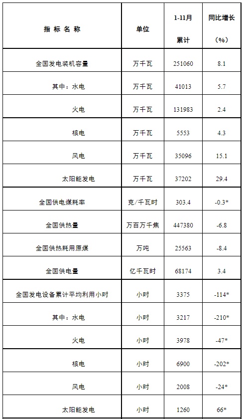 12月16日,国家能源局发布1-11月份全国电力工业统计数据。