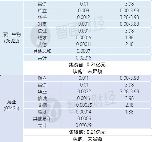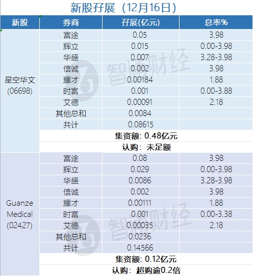 智通财经APP获悉,星空华文(06698)、Guanze Medical(02427)、康沣生物(06922)、澳亚(02425)正在招股中。截至12月16日,富途、耀才、辉立等合计为星空华文借出孖展0.08615亿港元,认购未足额;合计为Guanze Medical借出孖展0.14566亿港元,超认购逾0.2倍;合计为康沣生物借出孖展0.02216亿港元,认购未足额;合计为澳亚借出孖展0.02679亿港元,认购未足额。
