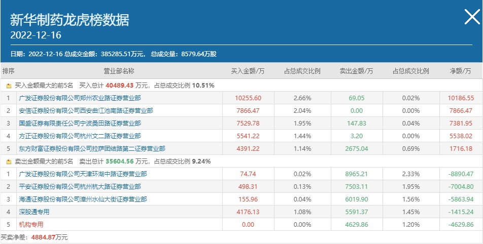 据沪深交易所今日公布的交易公开信息显示,新华制药因日涨幅偏离值达7%而再度登上龙虎榜,值得一提的是,此次是近5个交易日内第4次上榜。从龙虎榜公布的当日买卖数据来看,机构合计净卖出4629.86万元,北向资金合计净卖出1415.24万元。宁波桑田路等知名游资榜上有名。