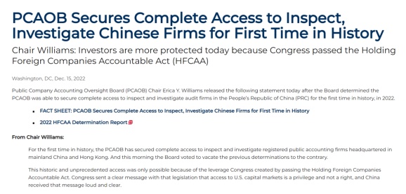 就在北京时间12月16日上午,美国公众公司会计监督委员会(PCAOB)发布报告,确认2022年度可以对中国内地和香港会计师事务所完成检查和调查,撤销2021年对相关事务所作出的认定。根据PCAOB发布的新闻稿,周四该机构通过投票确认“能够审计中概股”这一事实。有媒体报道,PCAOB 主席Williams在周四的新闻发布会上确认,随着本次审查完成,此前针对中概股的“摘牌”倒计时也会重置。