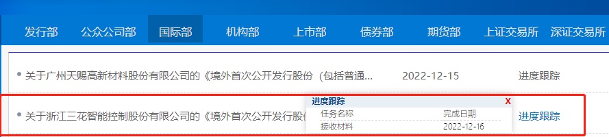智通财经APP获悉,12月16日,证监会公布浙江三花智能控制股份有限公司(三花智控,002050.SZ)的《境外首次公开发行股份(包括普通股、优先股等各类股票及股票的派生形式)审批》进度,目前进度已达接收材料阶段。