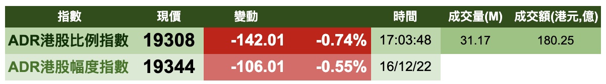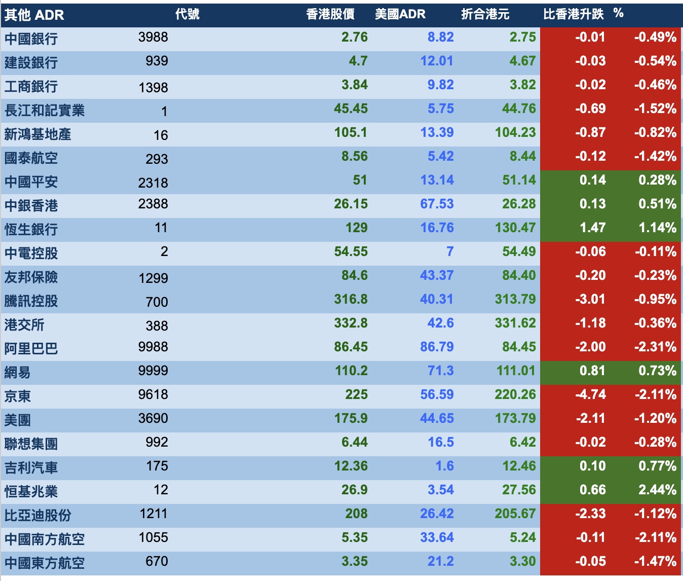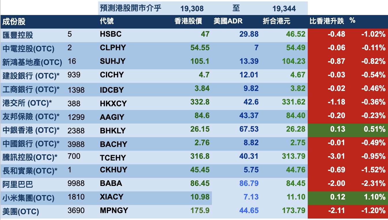 智通财经APP获悉,周五,美股三大指数集体收跌,港股ADR指数下跌,按比例计算,收报19308点,较香港收市跌142.01点或0.74%。