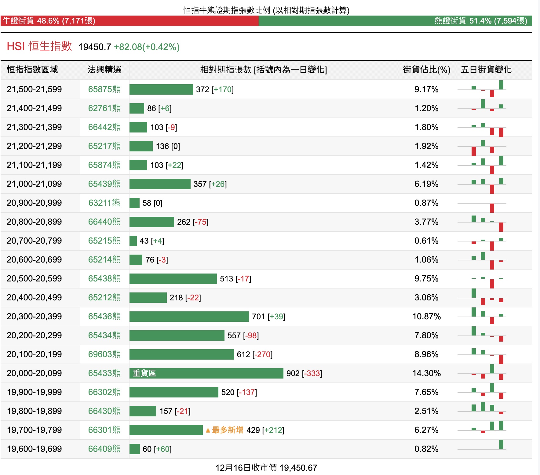 智通财经APP获悉,截至12月17日,恒指最新的牛熊街货比例为49:51。