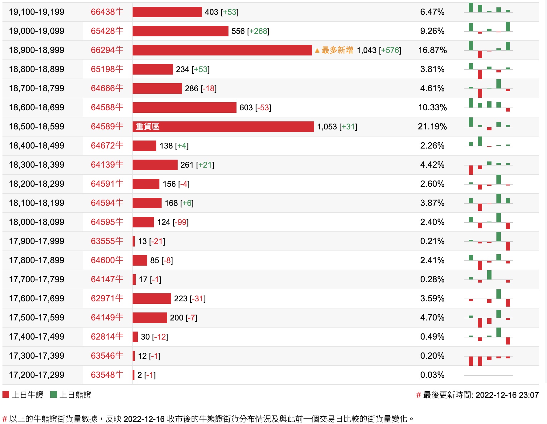 牛证街货重货区在18500-18599区间,该区间最新牛证数量为1053张,较上一交易日增加31张;最多新增在18900-18999区间,该区间最新熊证数量为1043张,较上一交易日增加576张;。