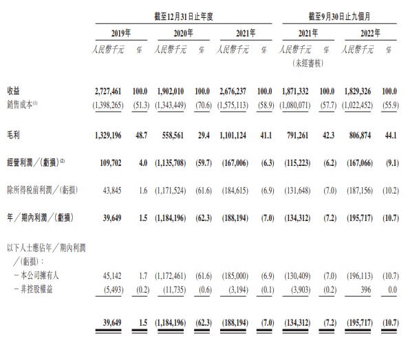 财务方面,2019年、2020年、2021年度以及2022年上半年,该公司收入分别为27.27亿元人民币、19.02亿元人民币、26.76亿元人民币以及18.29亿元人民币;同期,年内利润分别为为3964.9万元人民币、-11.84亿元人民币、-1.88亿元人民币以及-1.96亿元人民币。