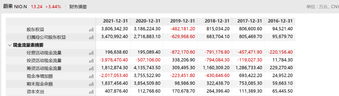 尽管账面仍有现金,但对烧钱的蔚来而言,183.75亿元并不能支撑太久。万得金融终端显示,2021年,蔚来投资活动现金流总计流出397.65亿元,而当年筹资活动现金流量又比上一年减少200多亿元。蔚来2021年年底现金余额比上一年减少近半。