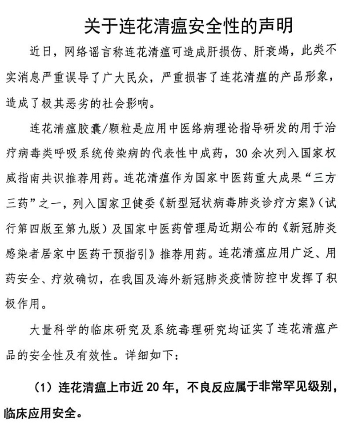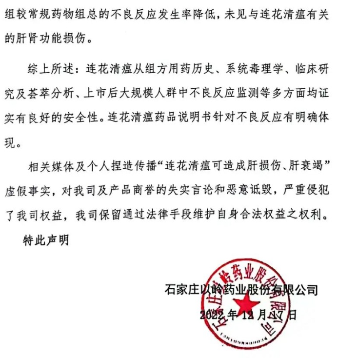 智通财经APP获悉,12月18日午间,以岭药业(002603.SZ)发布声明,近日,网络谣言称连花清瘟可造成肝损伤、肝衰竭,此类不实消息严重误导了广大民众,严重损害了连花清瘟的产品形象,造成了极其恶劣的社会影响。连花清瘟从组方用药历史、系统毒理学、临床研究及荟萃分析、上市后大规模人群中不良反应监测等多方面均证实有良好的安全性。连花清瘟药品说明书针对不良反应有明确体现。