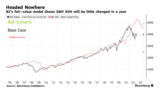 公允价值模型显示,虽然标普500指数已经反映了至少温和的盈利衰退,但更高的借贷成本和持续的经济不确定性可能会抑制明年股市的潜在涨幅。然而,股市何时触底仍是一场激烈的争论,利润预期可能仍然过于乐观。券商分析师预测标普500指数未来12个月的总目标点为4,498点,这是基于盈利将增长4.3%的假设——明显高于BI预测的隐含下降2%的模型。