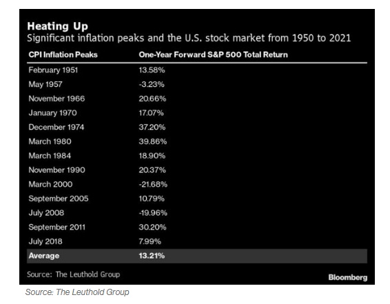 此外,最近通胀的降温提供了乐观的信号。the Leuthold Group首席投资策略师Jim Paulsen表示,自1950年以来,标普500指数在13个主要通胀高点后的12个月内的平均总回报率为13%。该公司的数据显示,在通胀大幅飙升后该指数上涨的10次案例中,标普500指数在随后一年的平均总回报率也达到了22%。