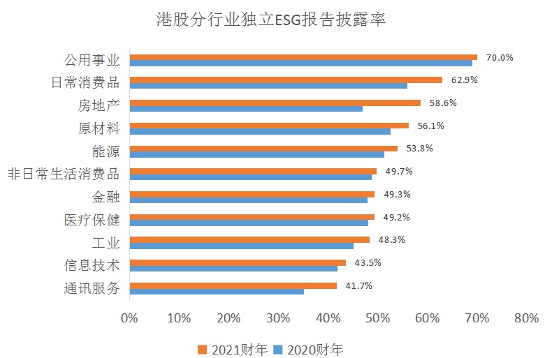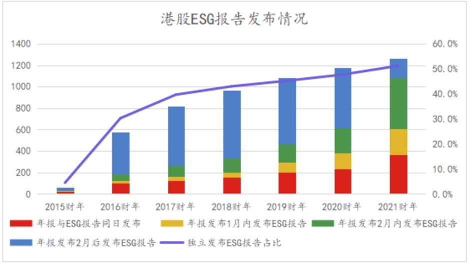在政策的指导下,香港ESG市场蓬勃发展,2021财年港股ESG报告披露率、及时性和披露质量显著提高。