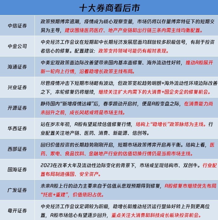 中信证券认为,疫情峰值在明年1月达峰,2月经济将快速恢复;海通证券认为,中美宏观政策进入新阶段,推动A股展开新一轮向上行情。