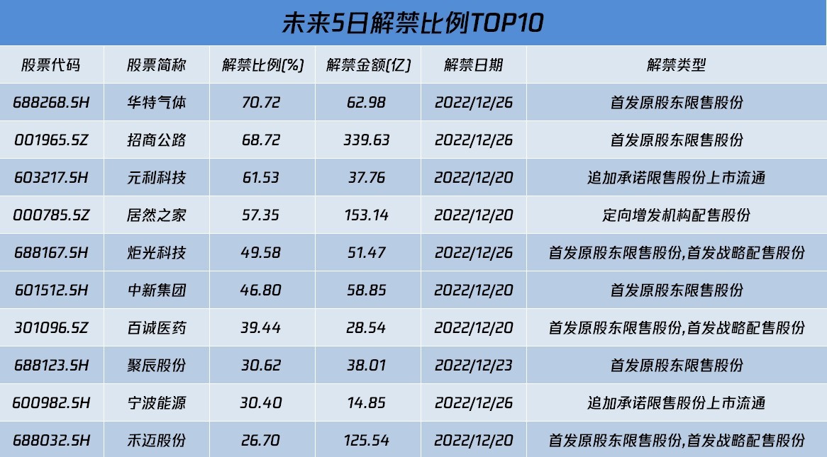 未来5日,解禁比例最高的股票为华特气体,其次为招商公路、元利科技;解禁市值居前的股票为招商公路、居然之家、禾迈股份。