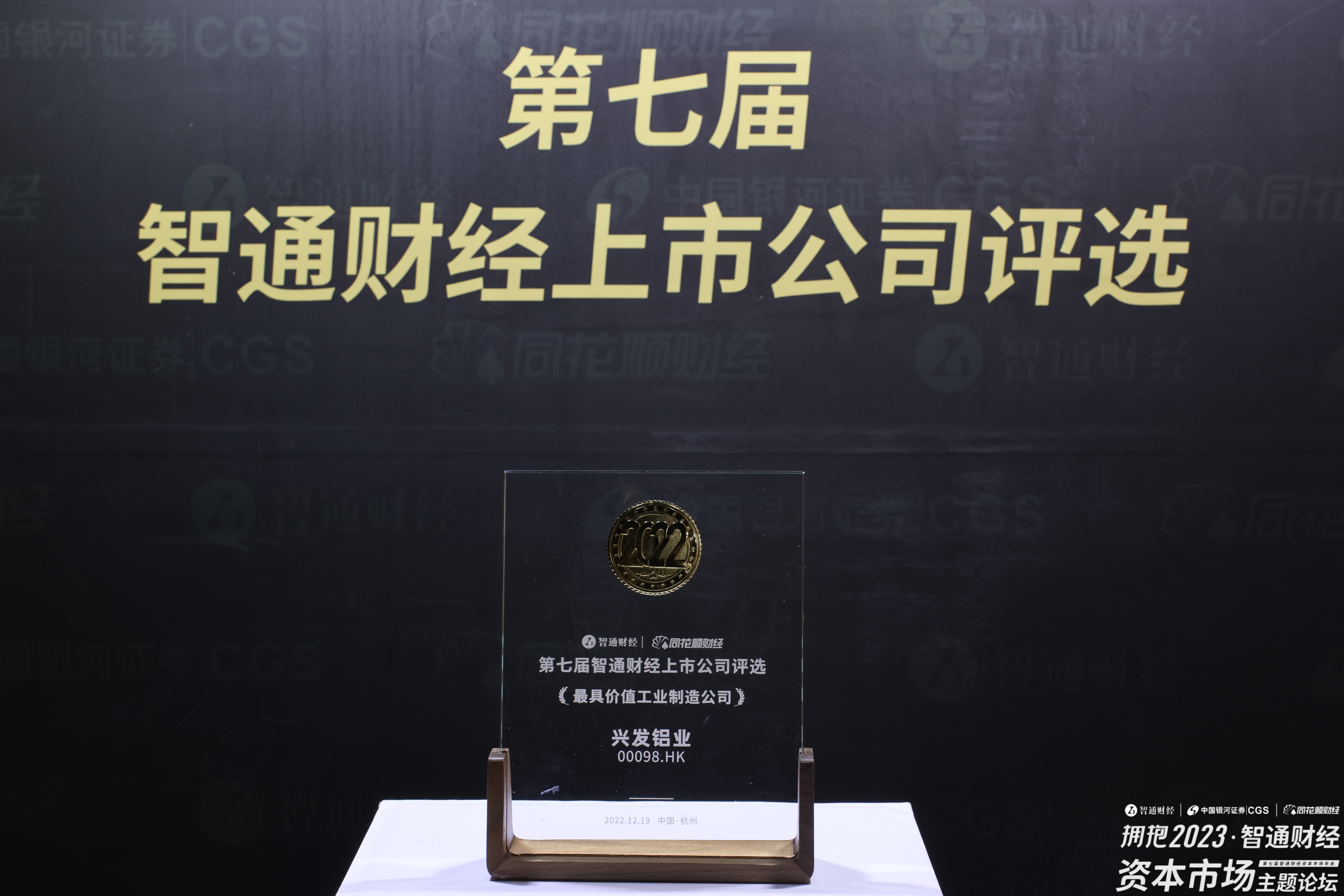 2022年12月19日上午12点,在杭州举办的“第七届智通财经上市公司评选”上,兴发铝业(00098)荣获“最具价值工业制造公司”大奖。