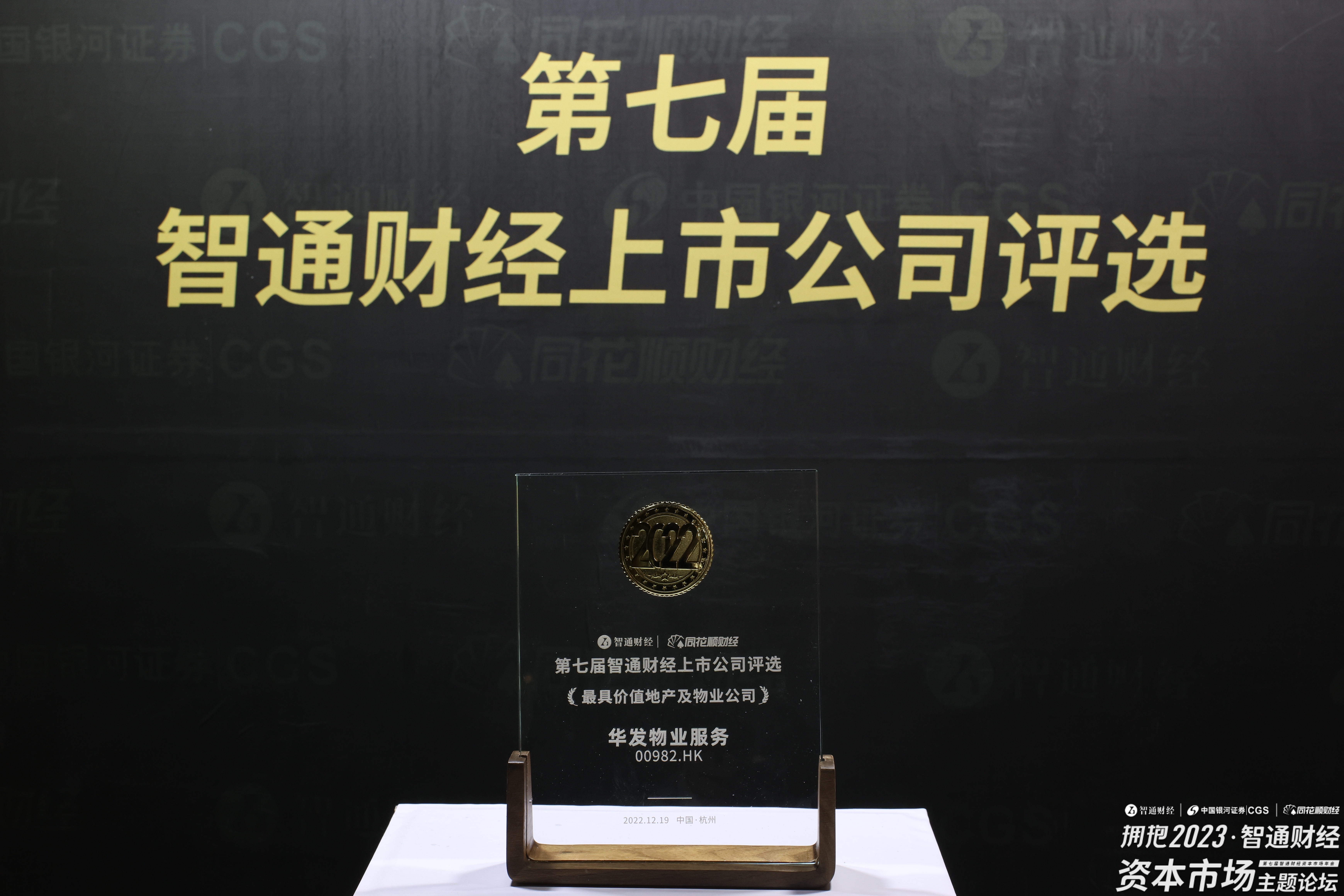 2022年12月19日上午12点,在杭州举办的“第七届智通财经上市公司评选”上,华发物业服务(00982)荣获“最具价值地产及物业公司”大奖。