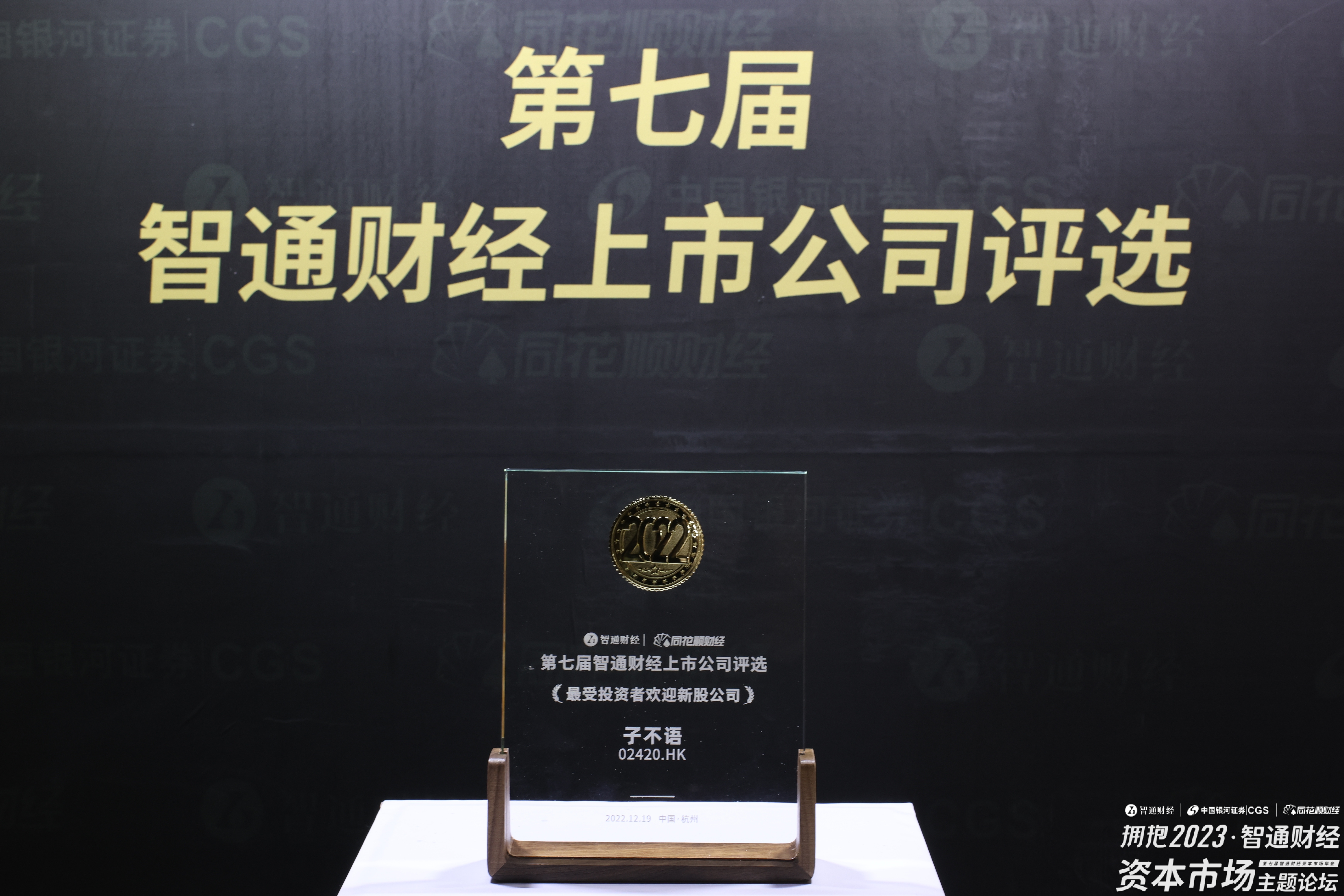 2022年12月19日上午12点,在杭州举办的“第七届智通财经上市公司评选”上,子不语(02420)荣获“最受投资者欢迎新股公司”大奖。