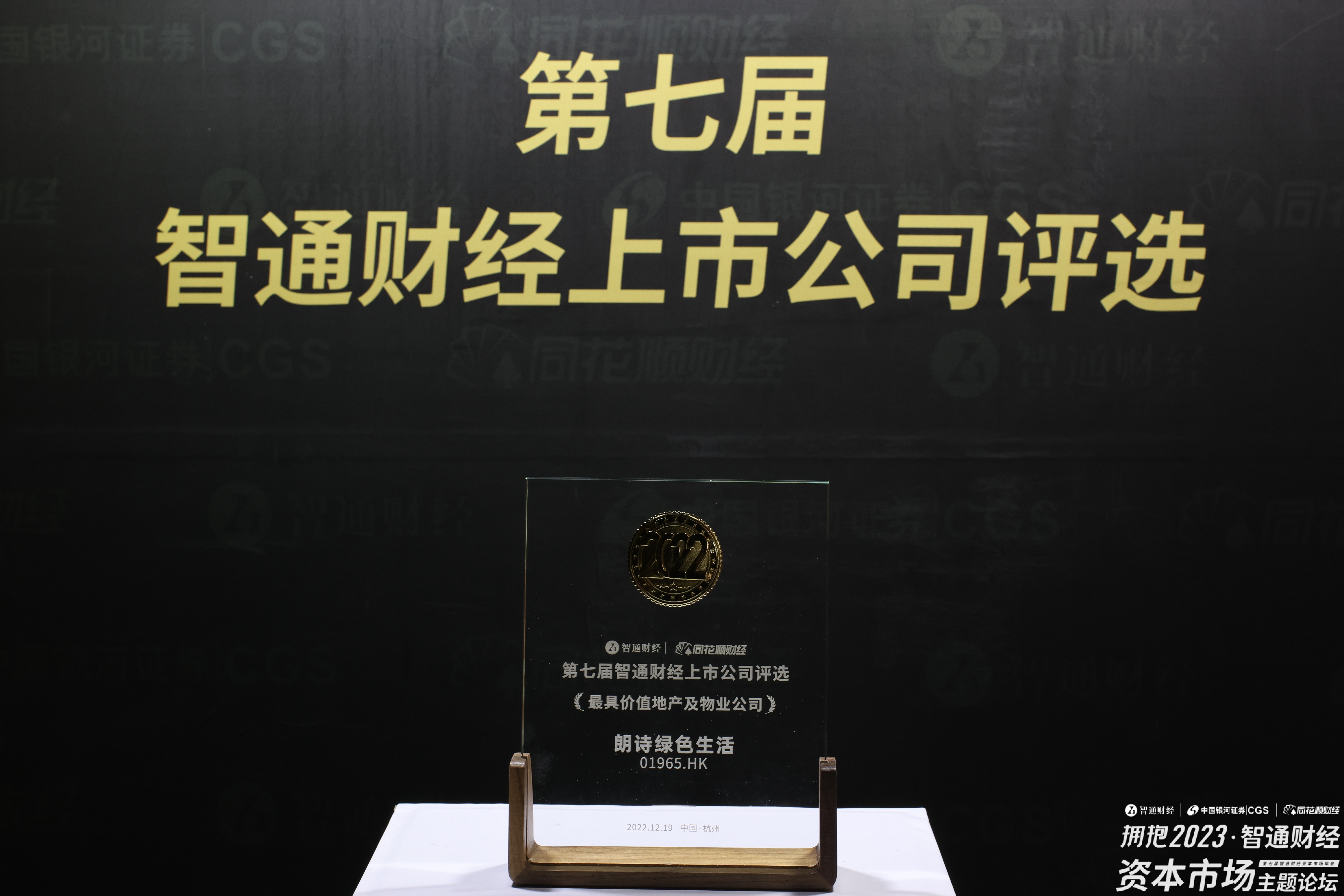 2022年12月19日上午12点,在杭州举办的“第七届智通财经上市公司评选”上,朗诗绿色生活(01965)荣获“最具价值地产及物业公司”大奖。