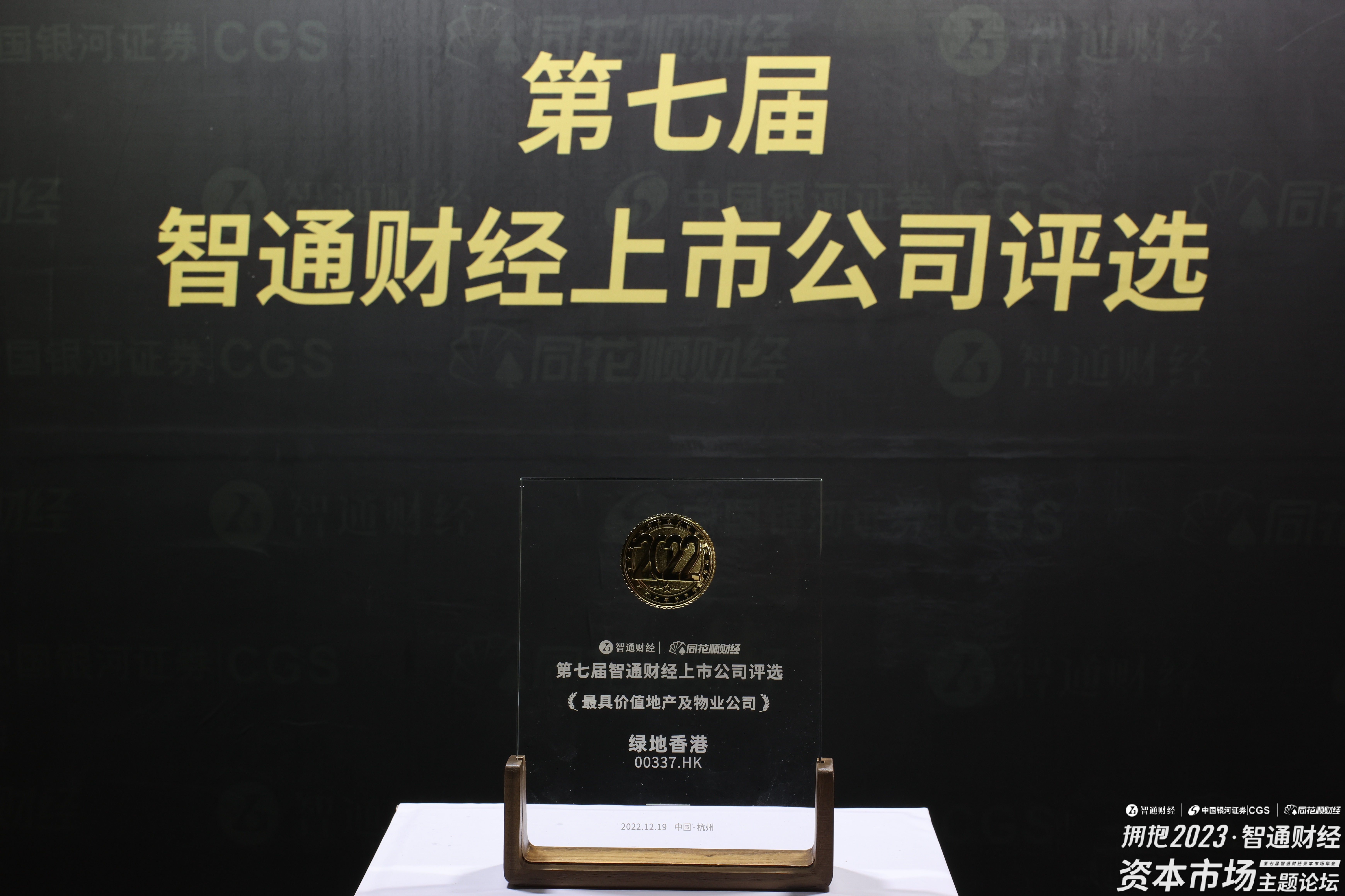 2022年12月19日上午12点,在杭州举办的“第七届智通财经上市公司评选”上,绿地香港(00337)荣获“最具价值地产及物业公司”大奖。