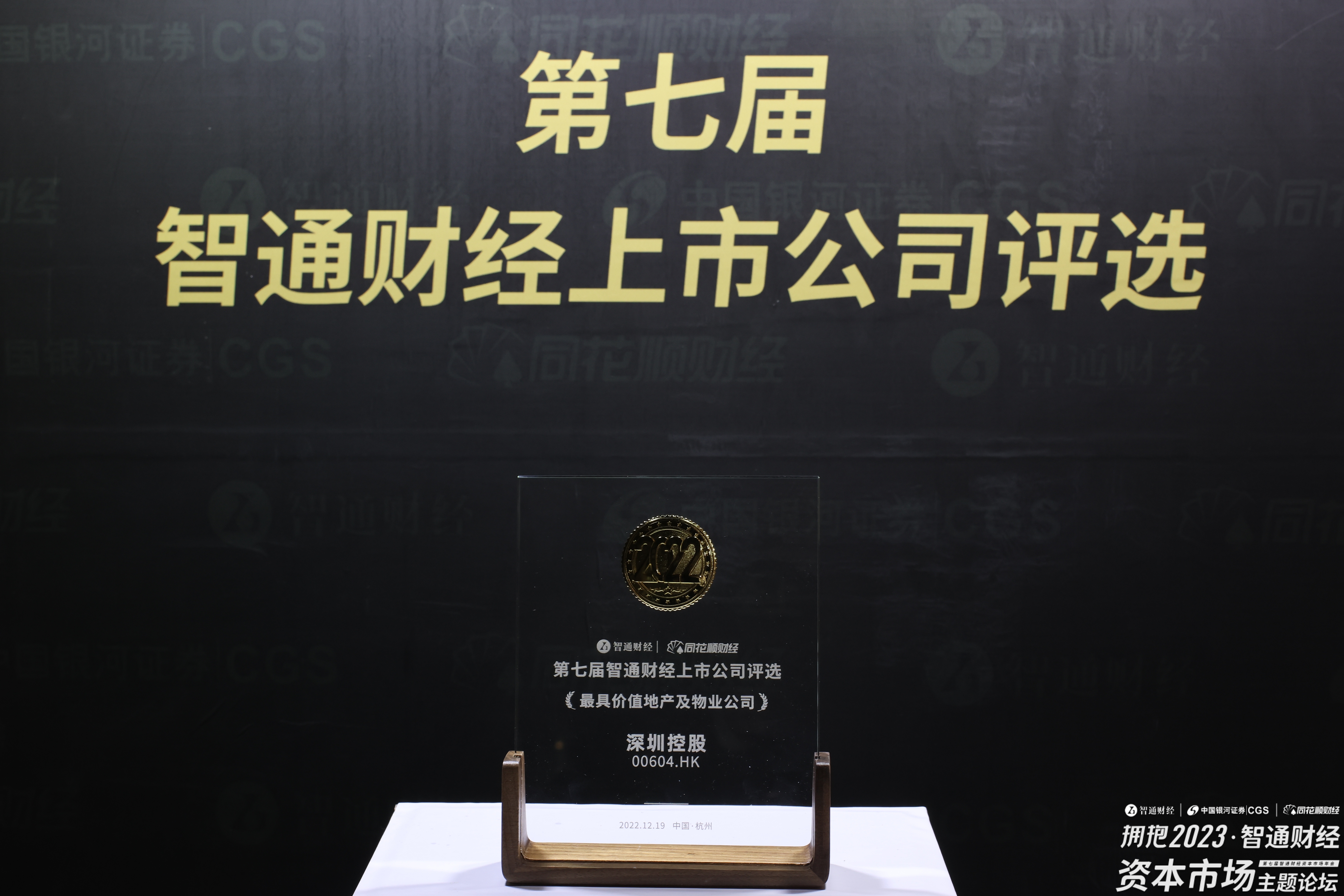 2022年12月19日上午12点,在杭州举办的“第七届智通财经上市公司评选”上,深圳控股(00604)荣获“最具价值地产及物业公司”大奖。
