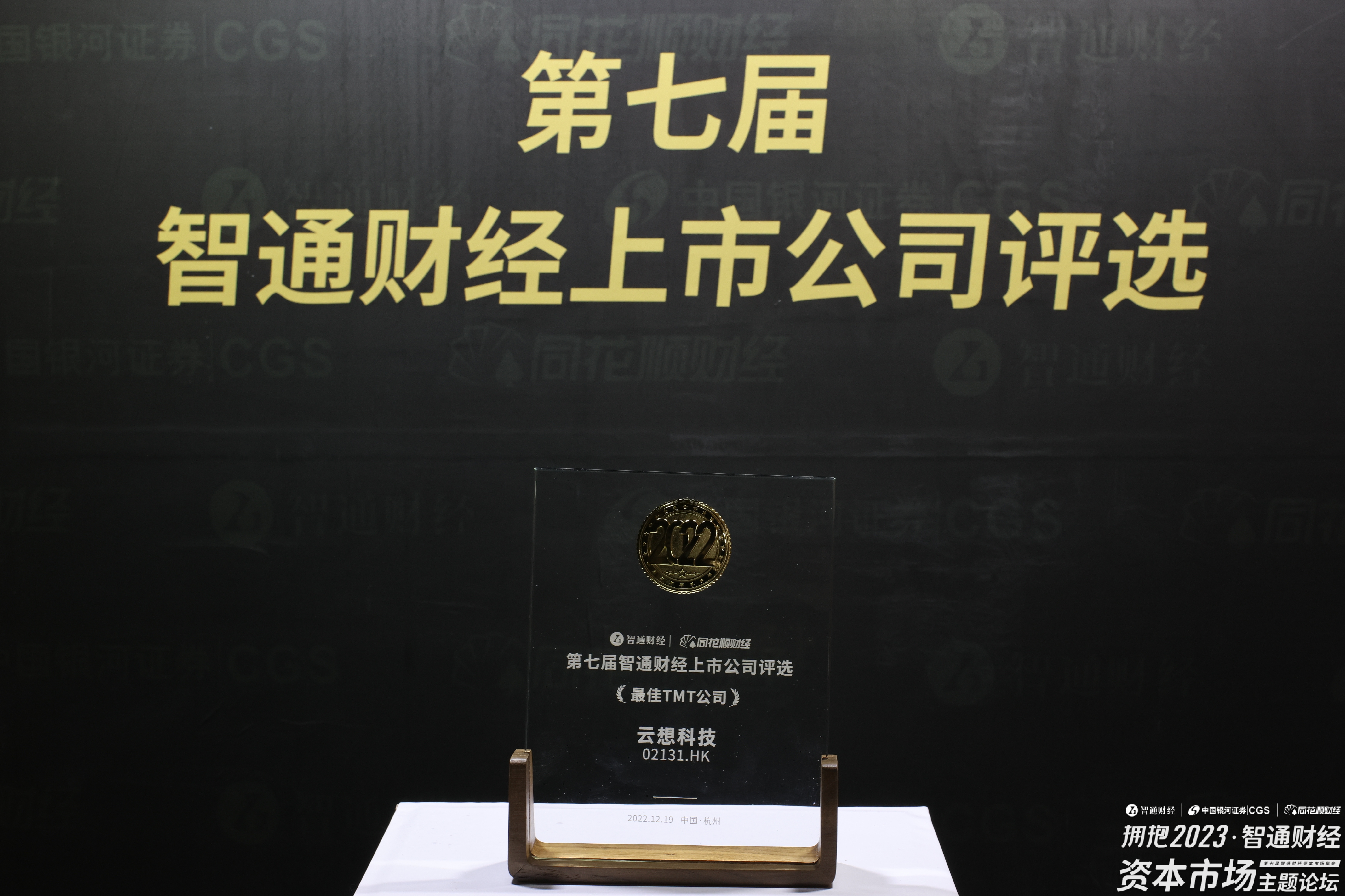 2022年12月19日上午12点,在杭州举办的“第七届智通财经上市公司评选”上,云想科技(02131)荣获“最佳TMT公司”大奖。