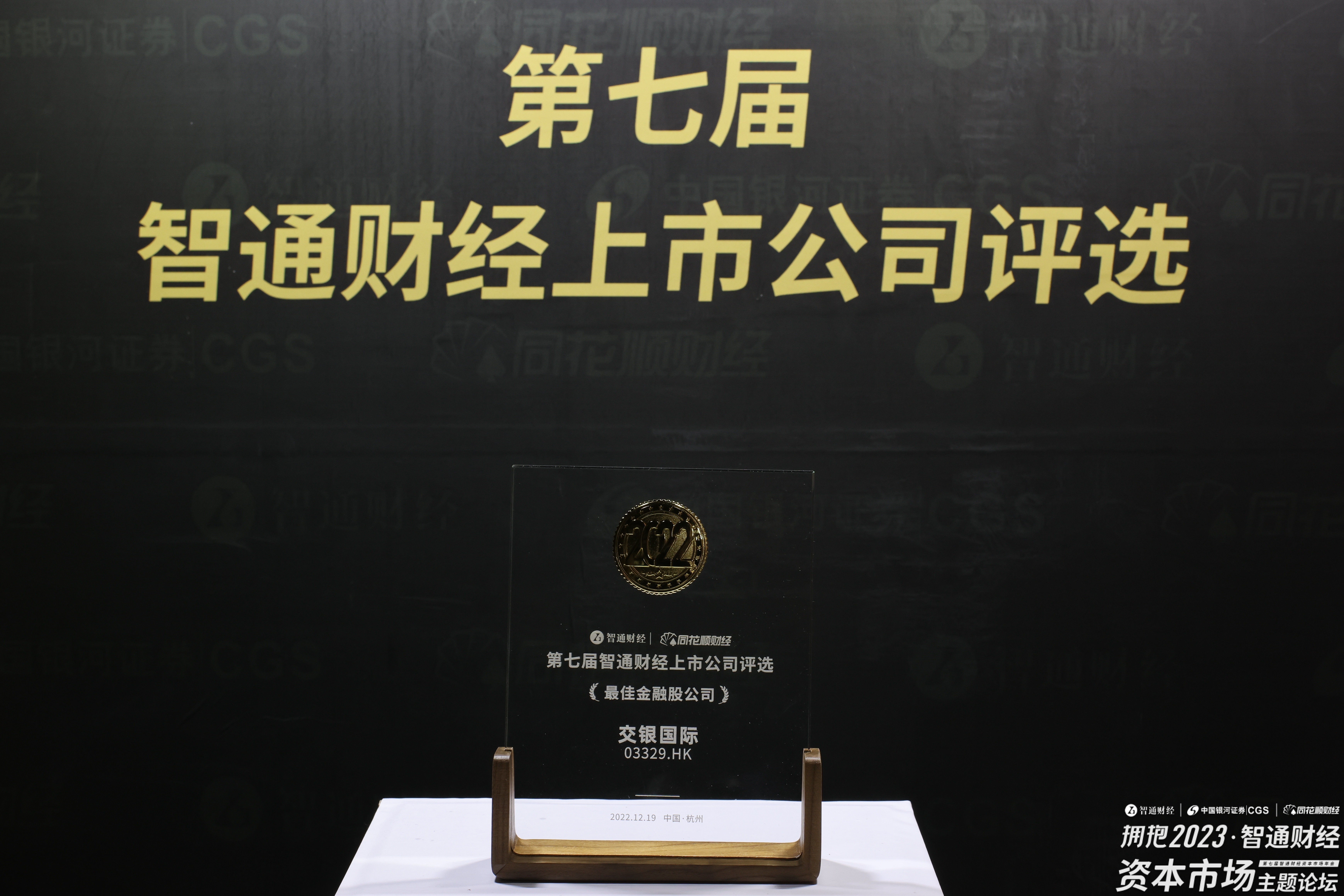 2022年12月19日上午12点,在杭州举办的“第七届智通财经上市公司评选”上,交银国际(03329)荣获“最佳金融公司”大奖。