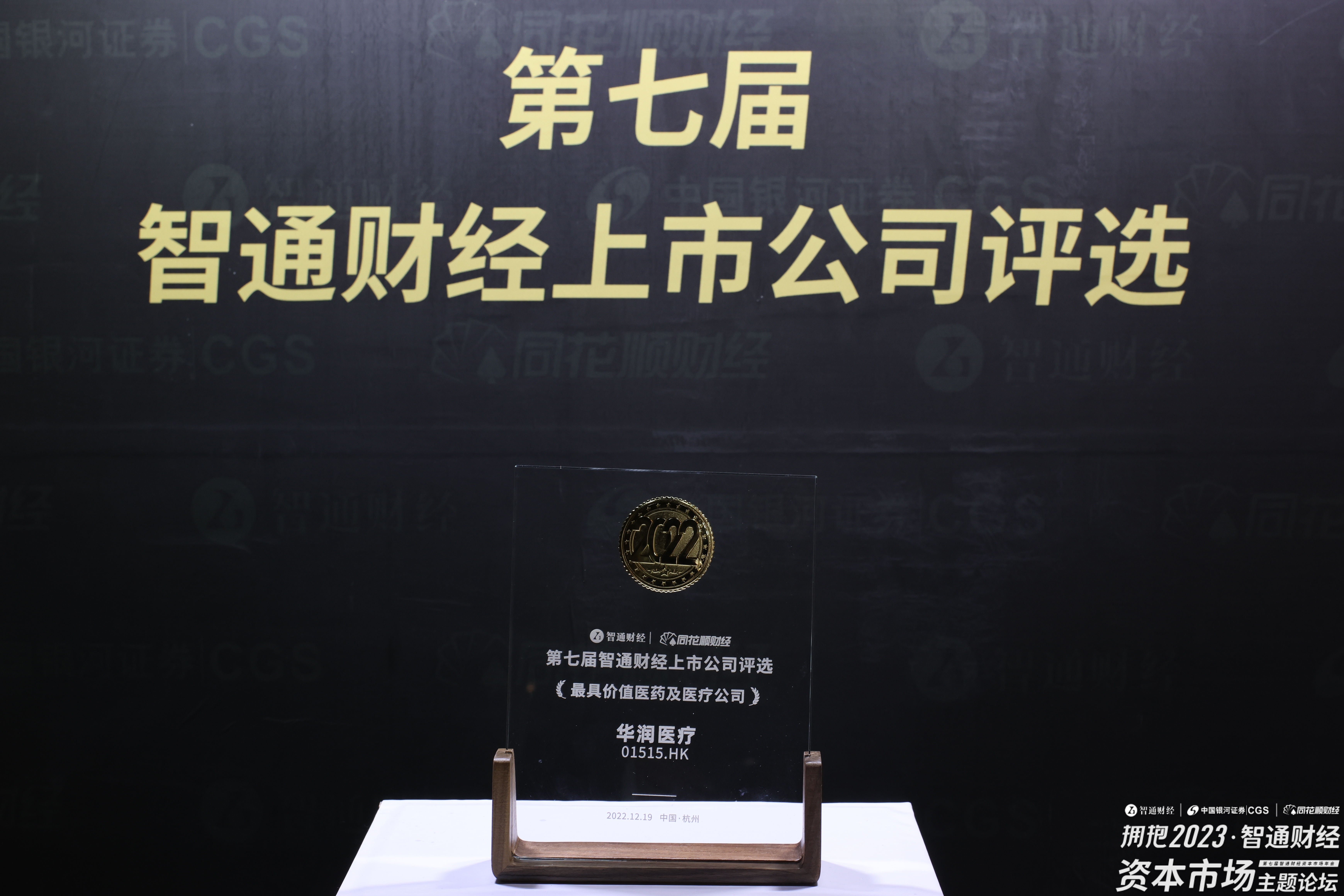 2022年12月19日上午12点,在杭州举办的“第七届智通财经上市公司评选”上,华润医疗(01515)荣获“最具价值医药及医疗公司”大奖。