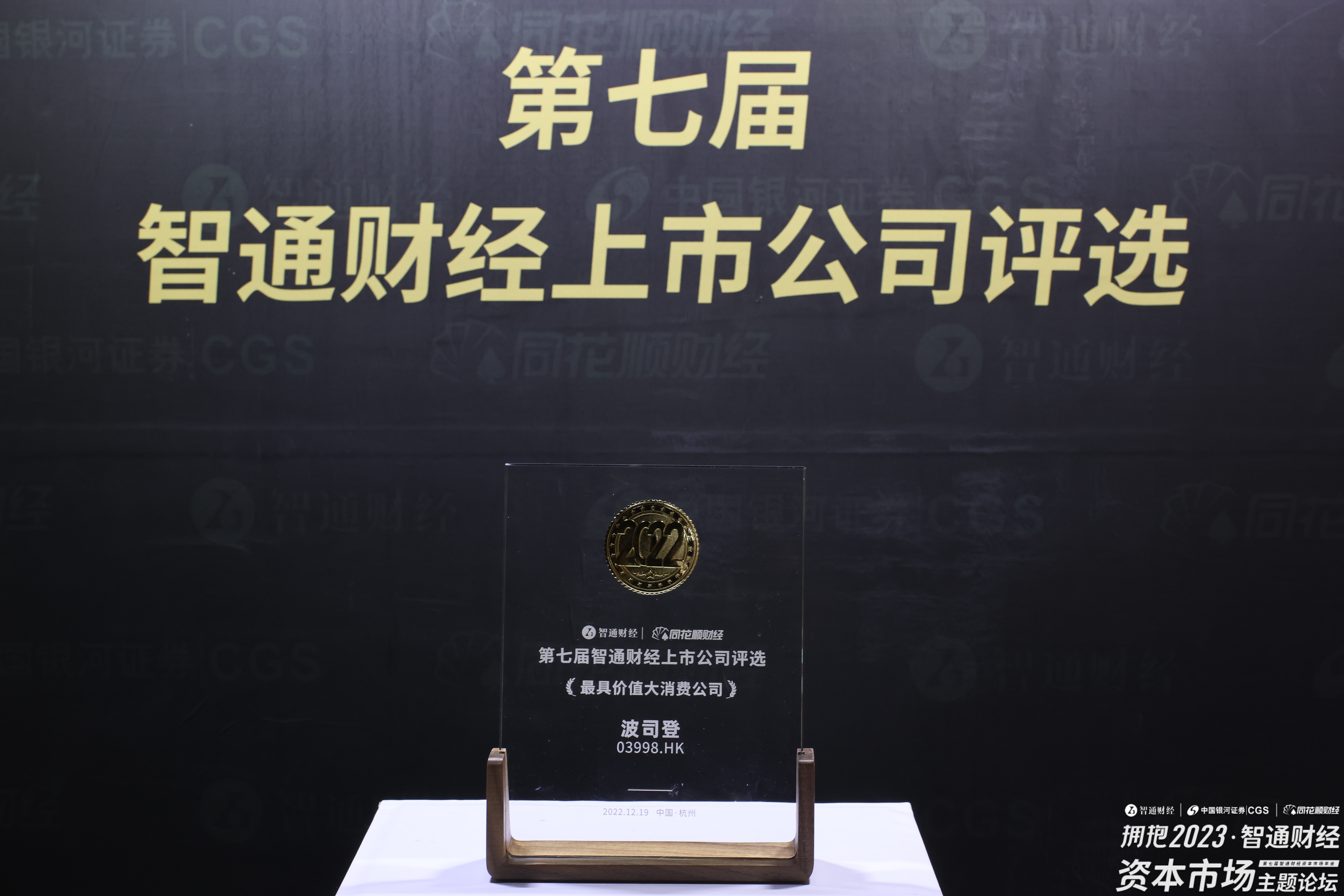 2022年12月19日上午12点,在杭州举办的“第七届智通财经上市公司评选”上,波司登(03998)荣获“最具价值大消费公司”大奖