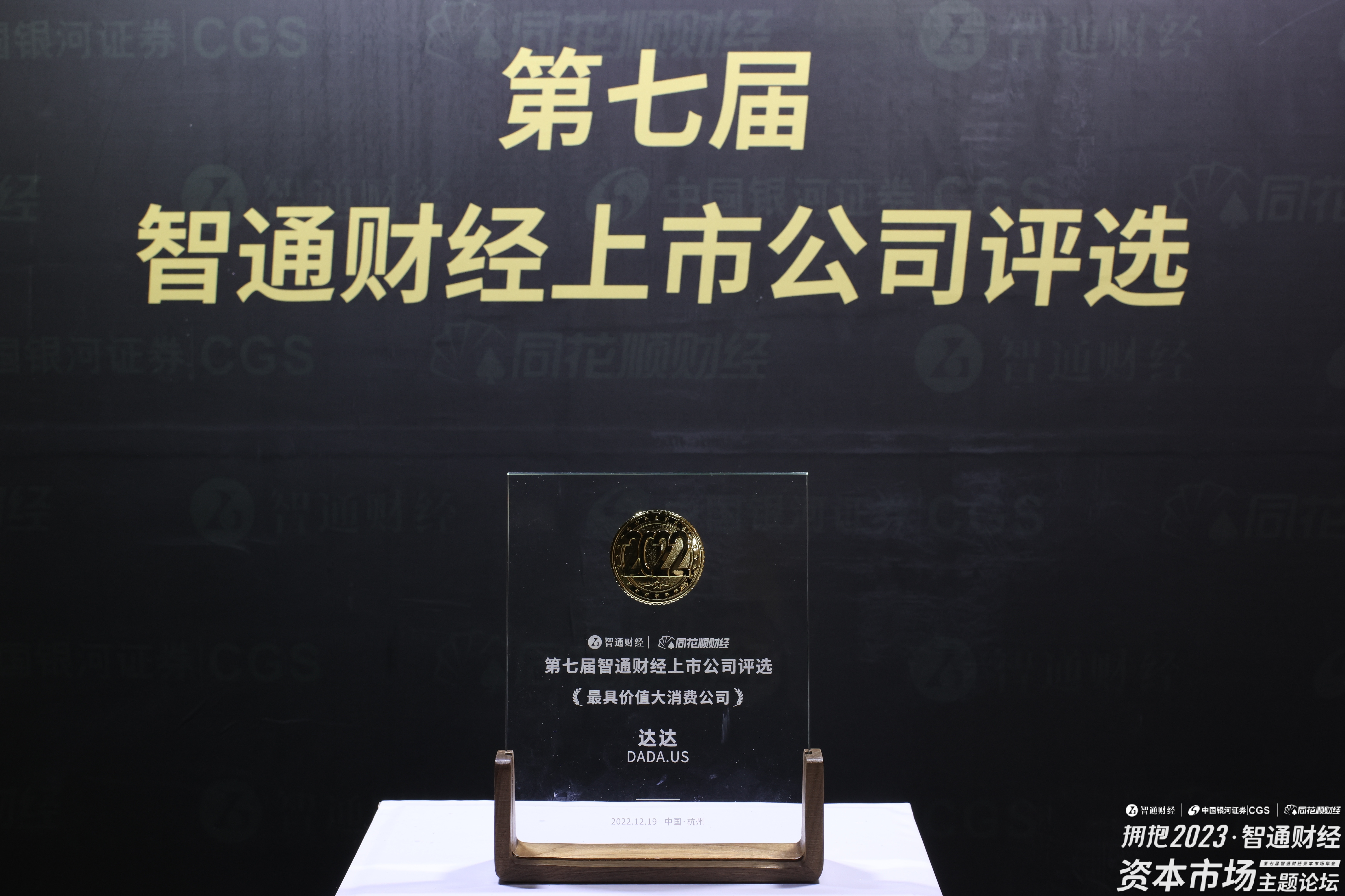 2022年12月19日上午12点,在杭州举办的“第七届智通财经上市公司评选”上,达达(DADA.US)荣获“最具价值大消费公司”大奖