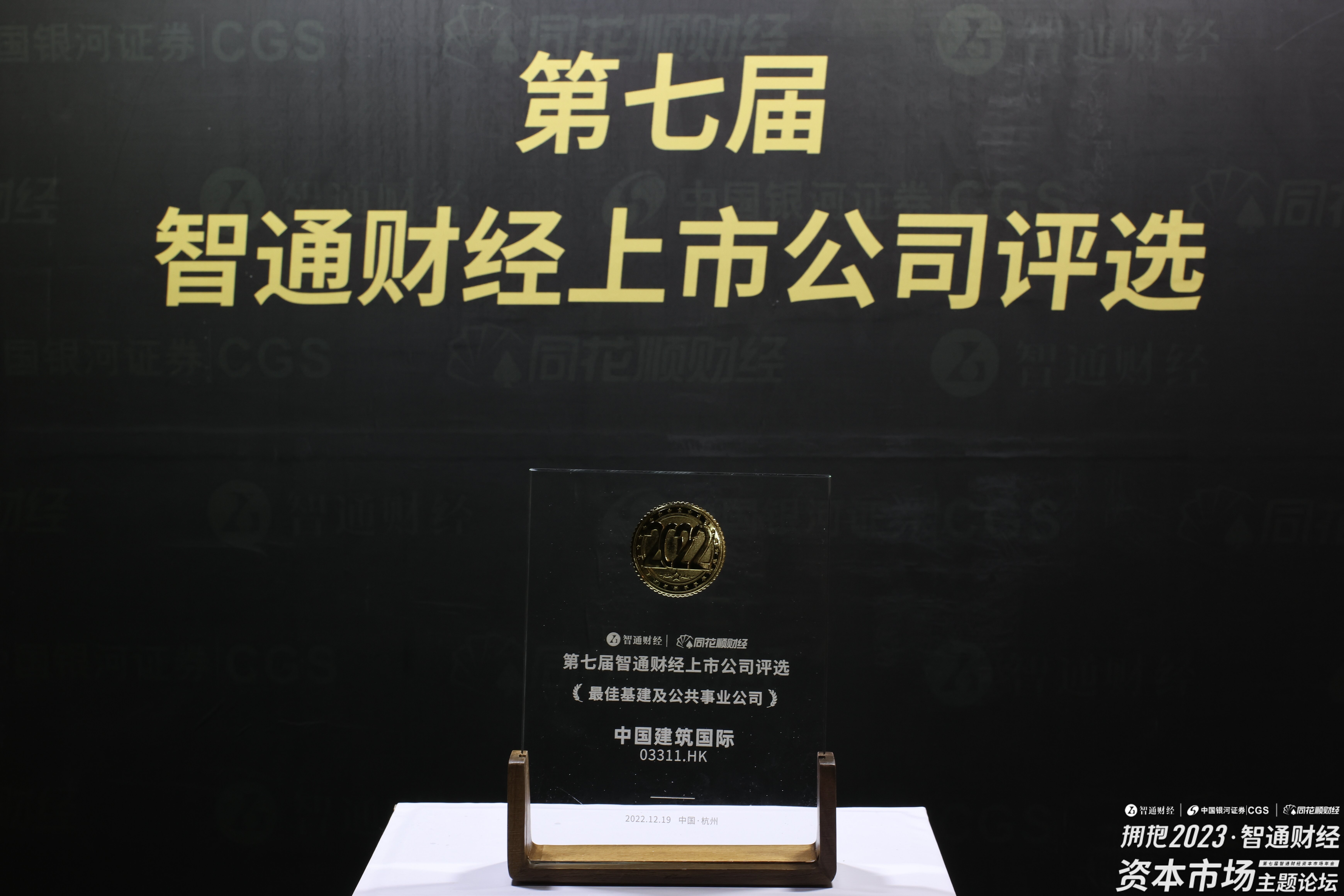 2022年12月19日上午12点,在杭州举办的“第七届智通财经上市公司评选”上,中国建筑国际(03311)荣获“最佳基建及公共事业公司”大奖。