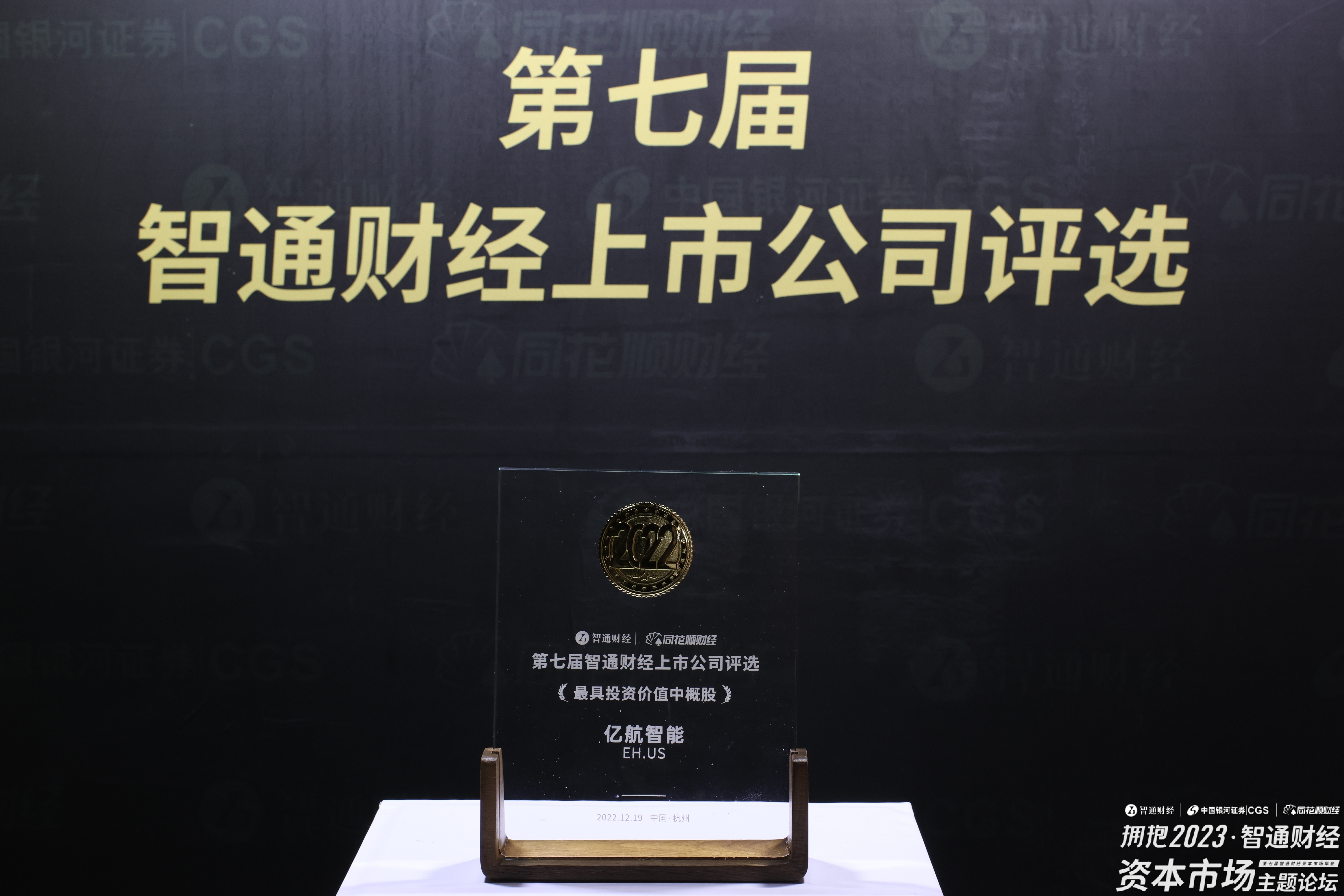 2022年12月19日上午12点,在杭州举办的“第七届智通财经上市公司评选”上,亿航智能(EH.US)荣获“最具投资价值中概股”大奖。