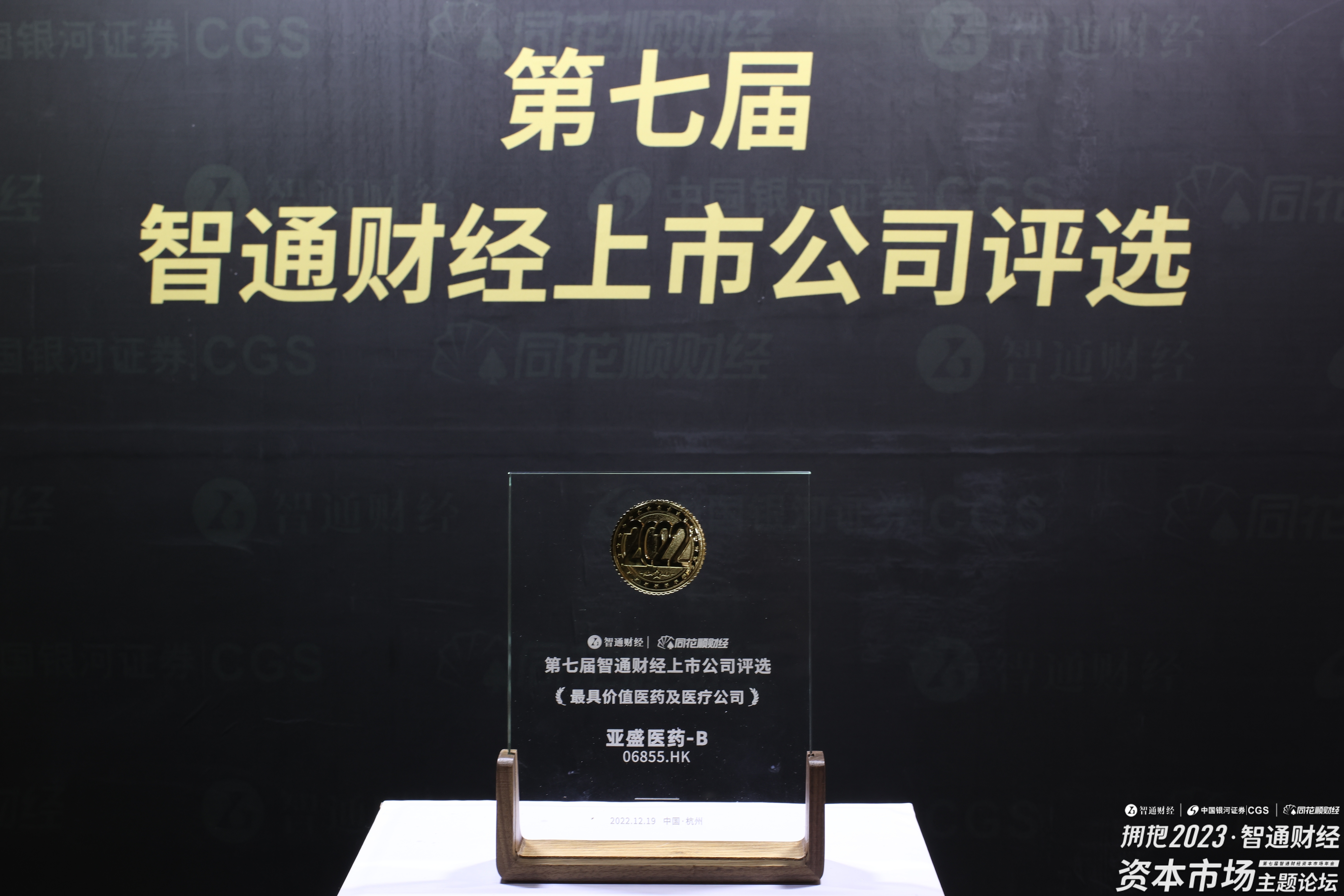 2022年12月19日上午12点,在杭州举办的“第七届智通财经上市公司评选”上,亚盛医药-B(06855)荣获“最具价值医药及医疗公司”大奖。