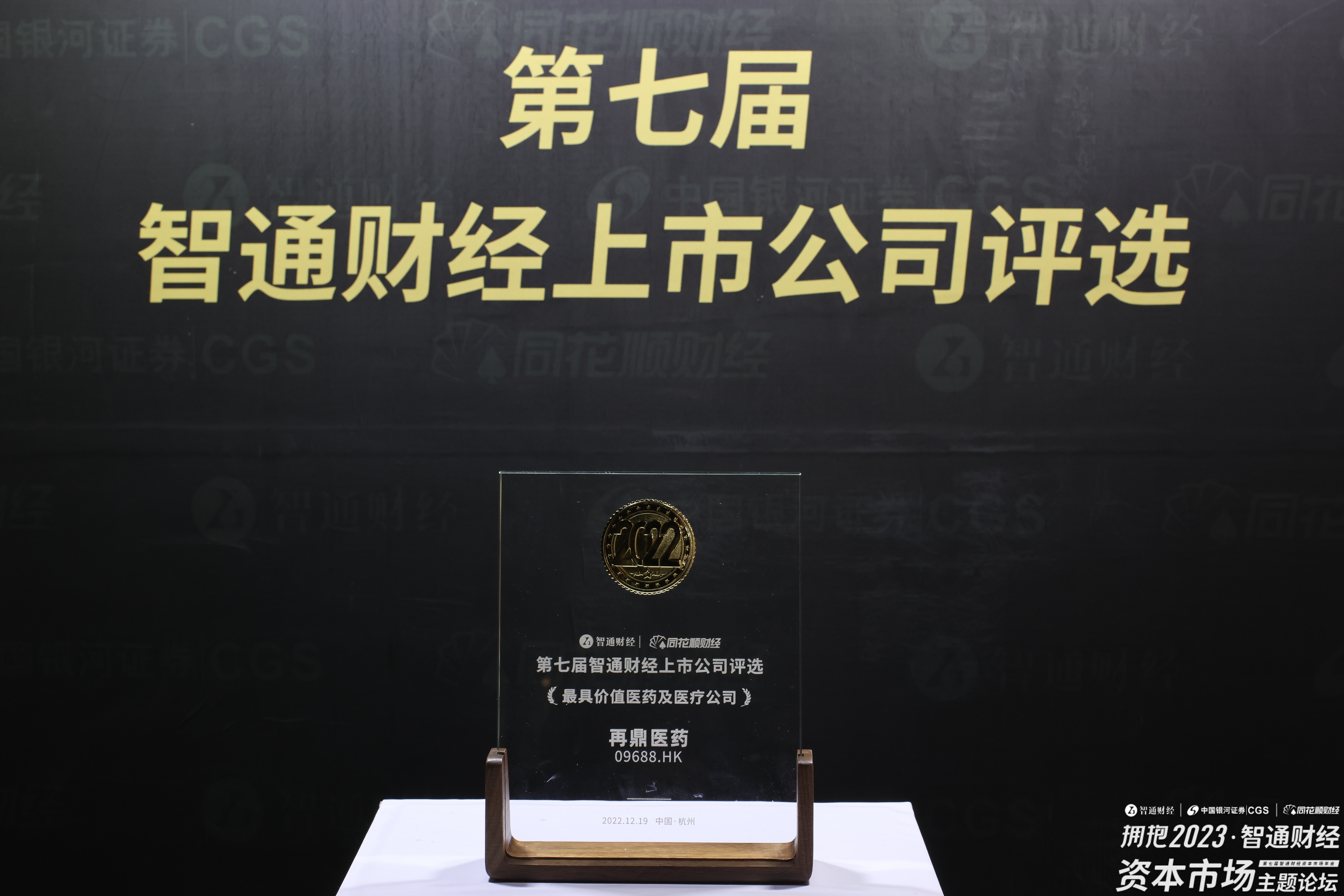 2022年12月19日上午12点,在杭州举办的“第七届智通财经上市公司评选”上,再鼎医药(09688)荣获“最具价值医药及医疗公司”大奖。