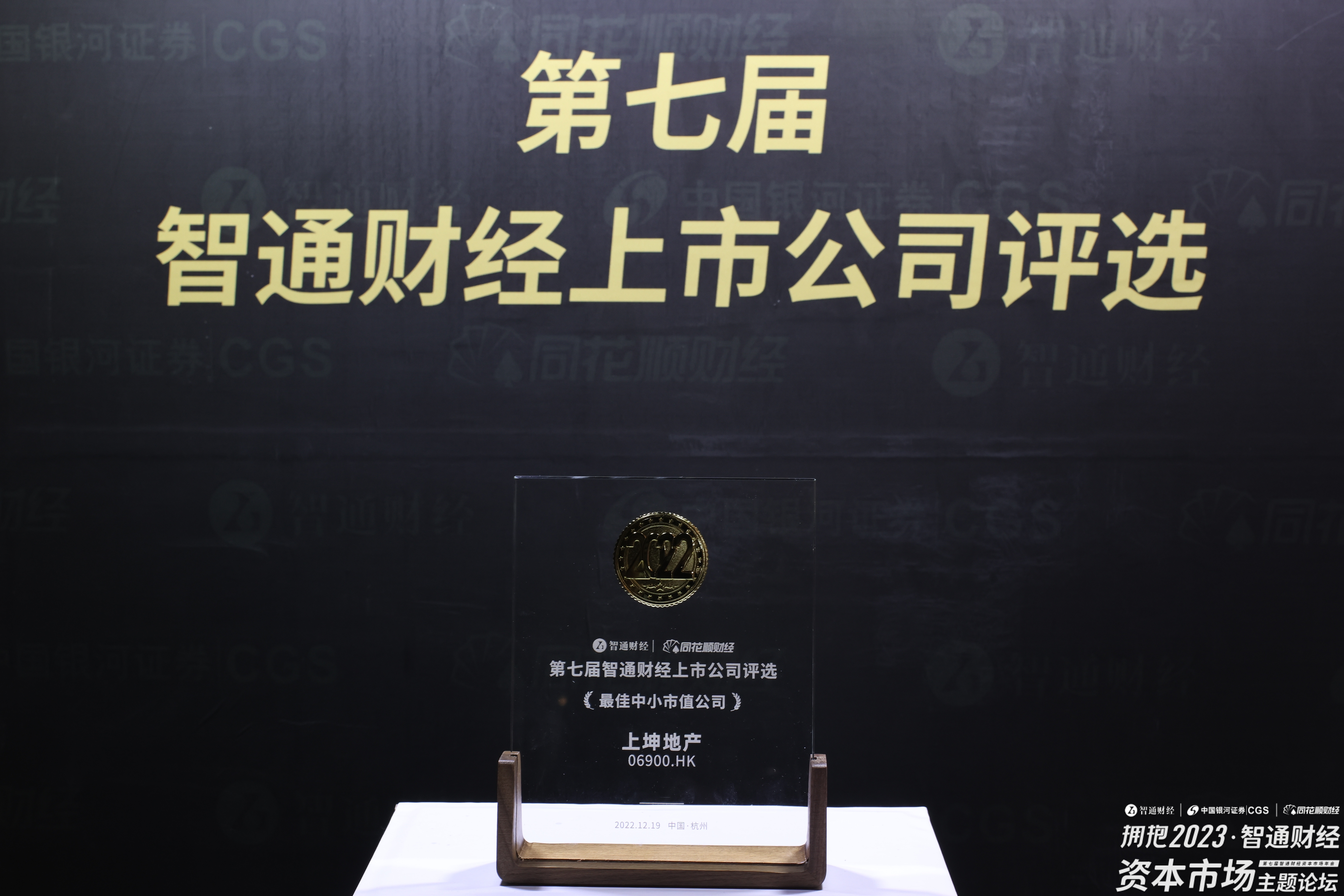 2022年12月19日上午12点,在杭州举办的“第七届智通财经上市公司评选”上,上坤地产(06900)荣获“最佳中小市值公司”大奖。