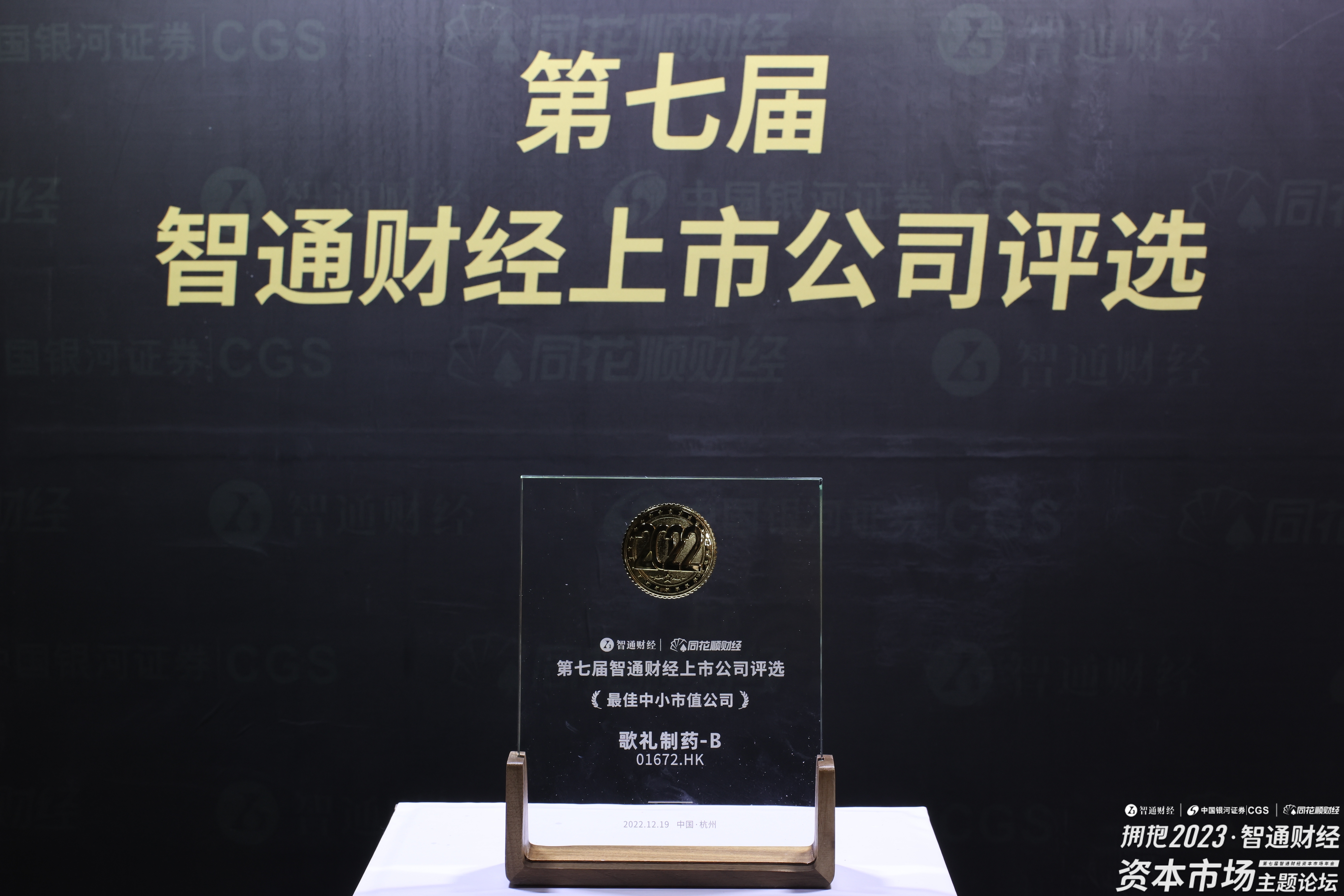 2022年12月19日上午12点,在杭州举办的“第七届智通财经上市公司评选”上,歌礼制药-B(01672)荣获“最佳中小市值公司”大奖。