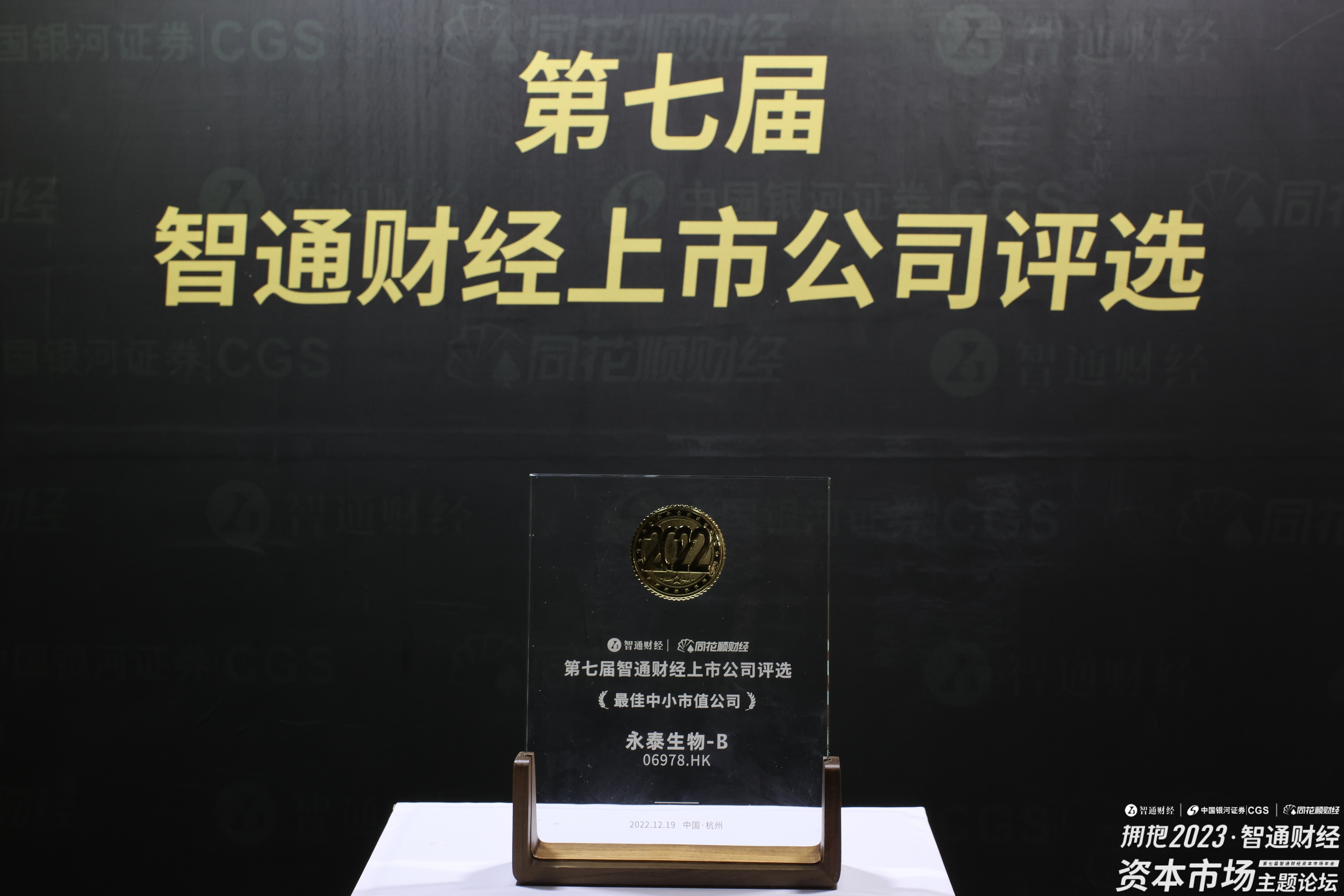 2022年12月19日上午12点,在杭州举办的“第七届智通财经上市公司评选”上,永泰生物-B(06978)荣获“最佳中小市值公司”大奖。