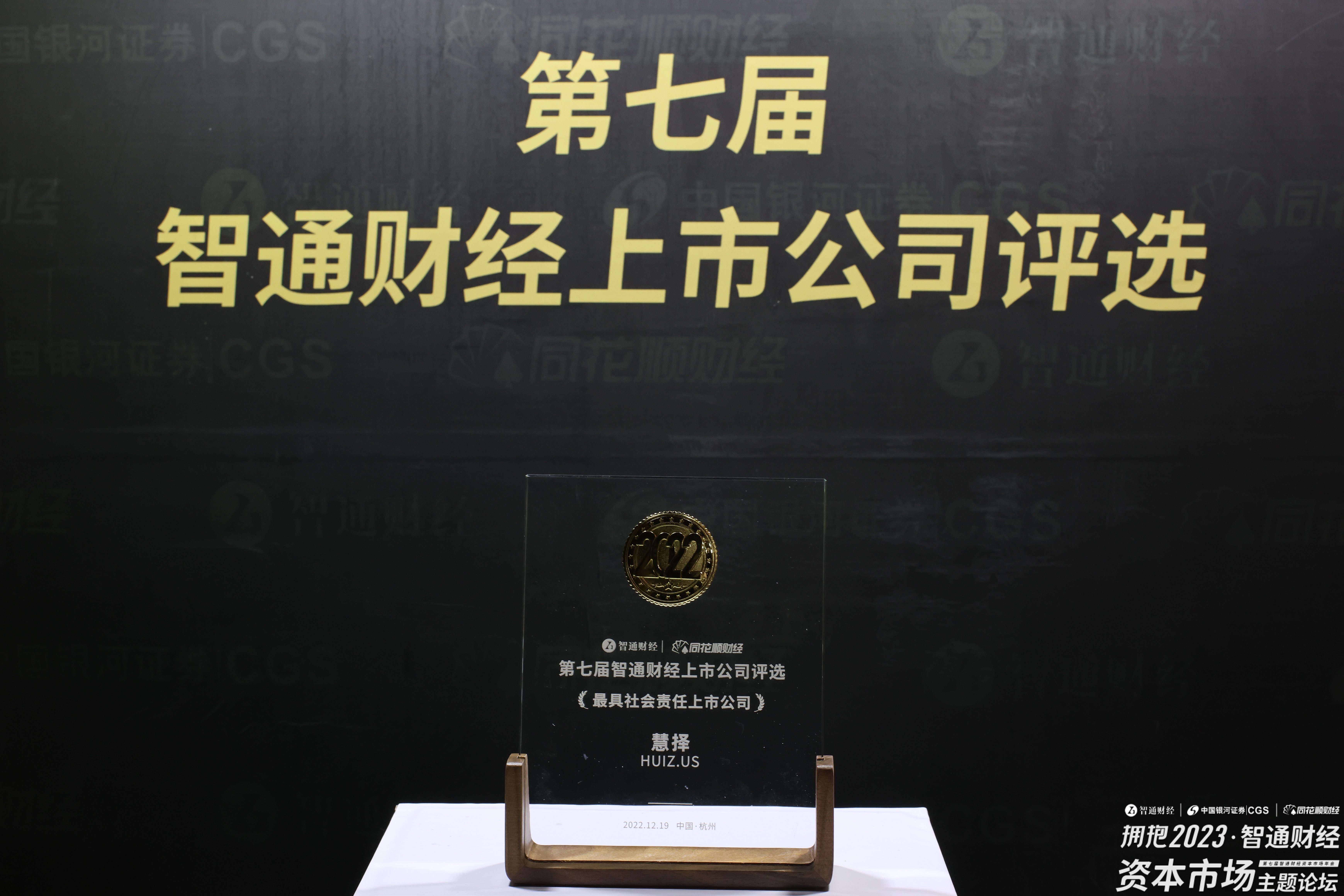 2022年12月19日上午12点,在杭州举办的“第七届智通财经上市公司评选”上,慧择(HUIZ.US)荣获“最具社会责任上市公司”大奖。