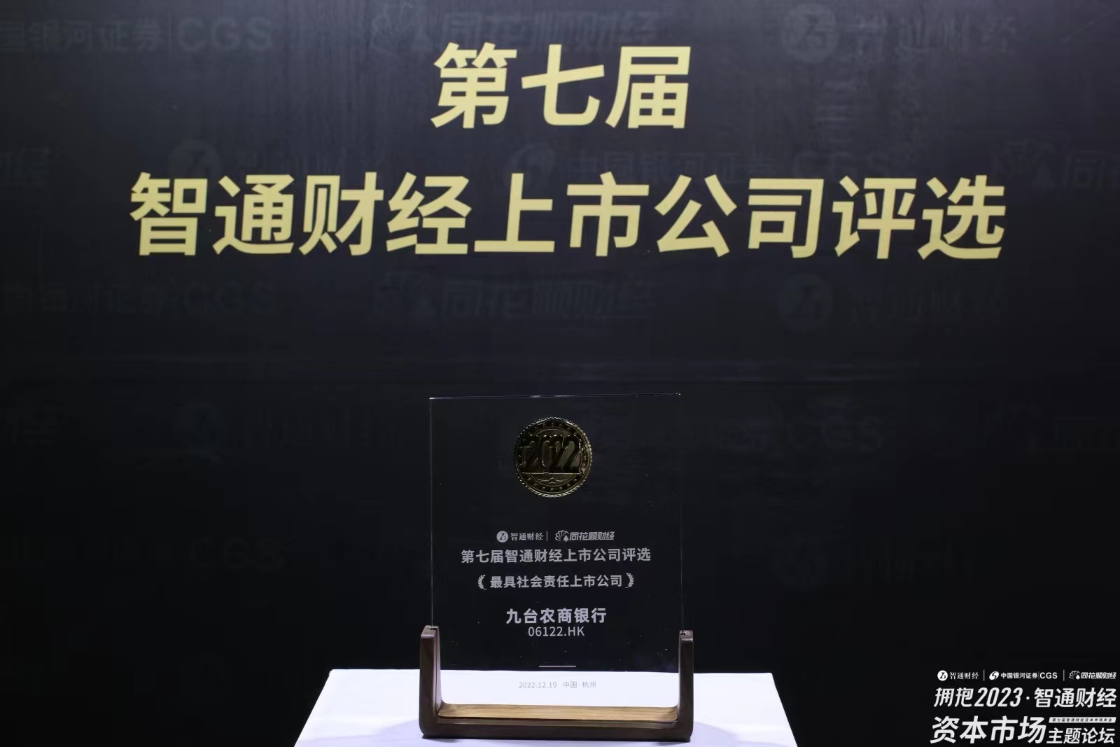 2022年12月19日上午12点,在杭州举办的“第七届智通财经上市公司评选”上,九台农商银行(06122)荣获“最具社会责任上市公司”大奖。