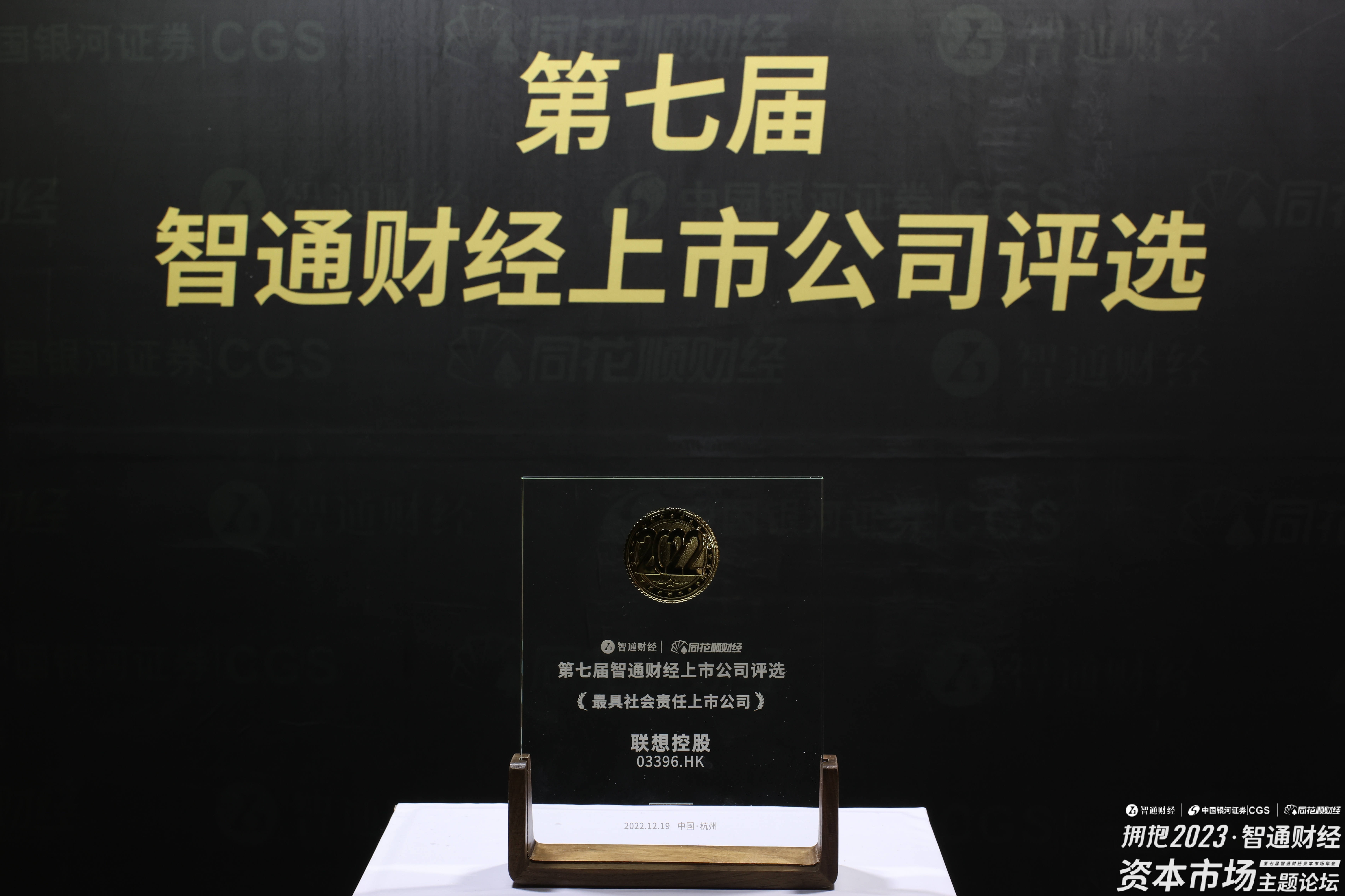 2022年12月19日上午12点,在杭州举办的“第七届智通财经上市公司评选”上,联想控股(03396)荣获“最具社会责任上市公司”大奖。