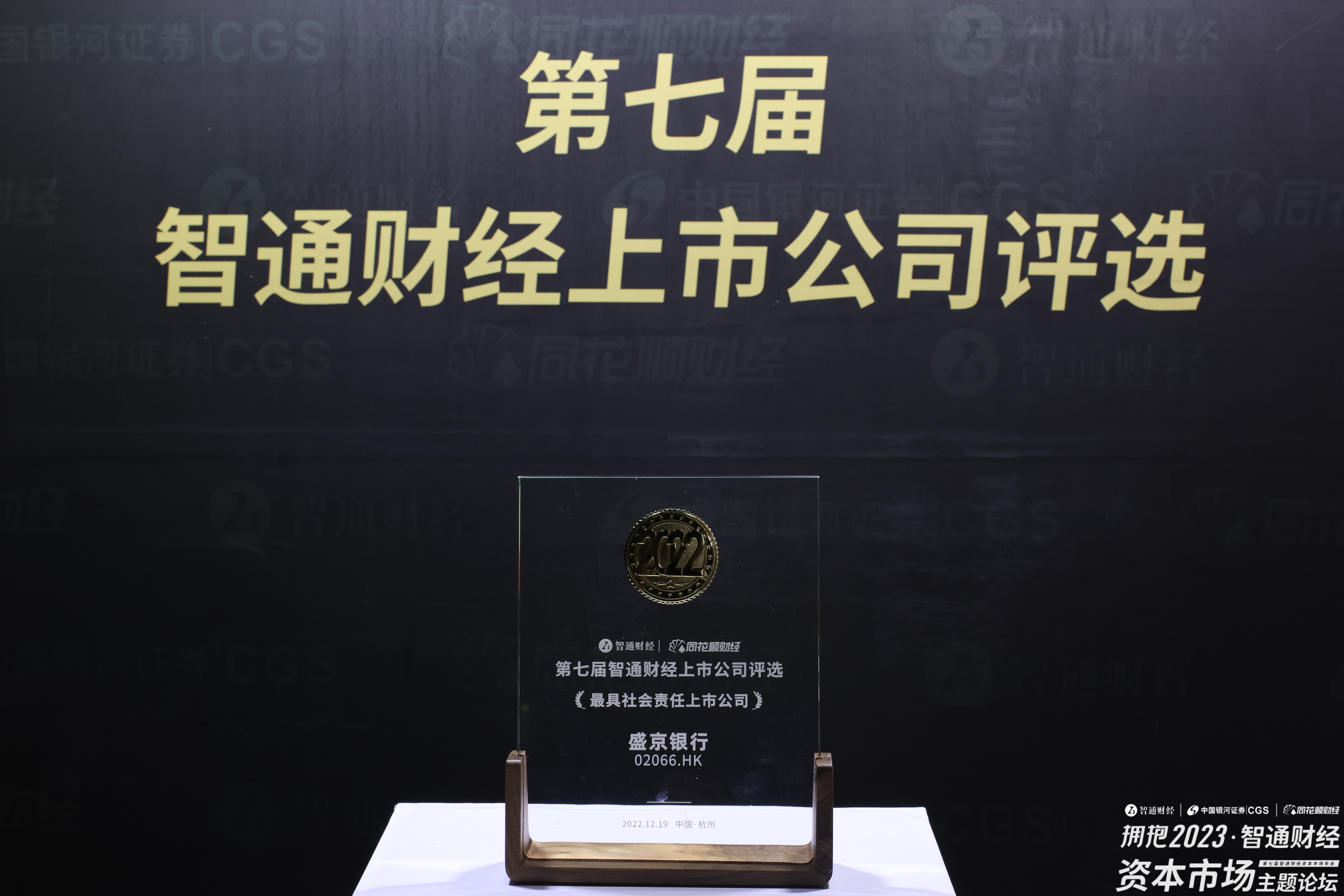 2022年12月19日上午12点,在杭州举办的“第七届智通财经上市公司评选”上,盛京银行(02066)荣获“最具社会责任上市公司”大奖。