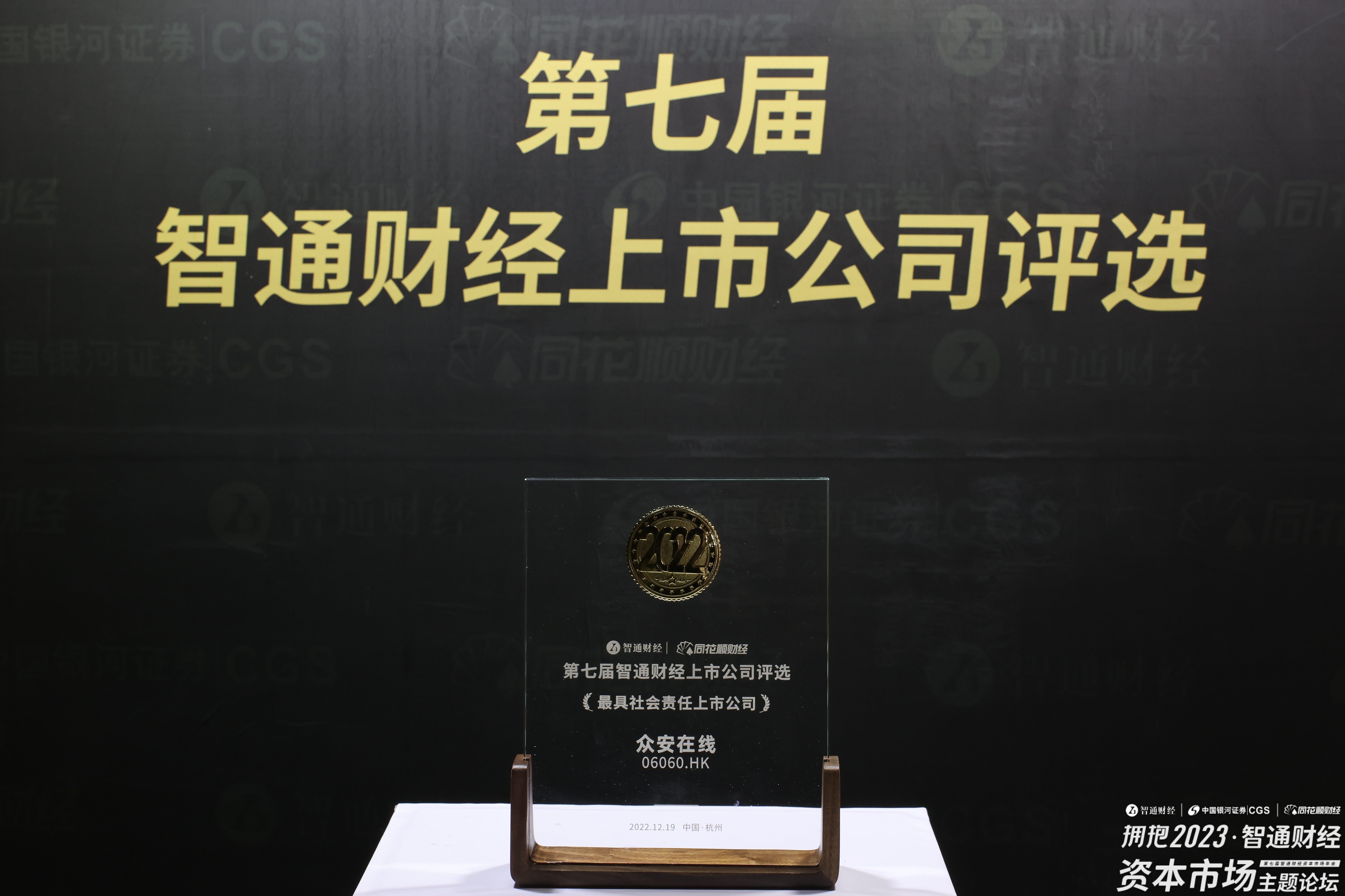 2022年12月19日上午12点,在杭州举办的“第七届智通财经上市公司评选”上,众安在线(06060)荣获“最具社会责任上市公司”大奖。